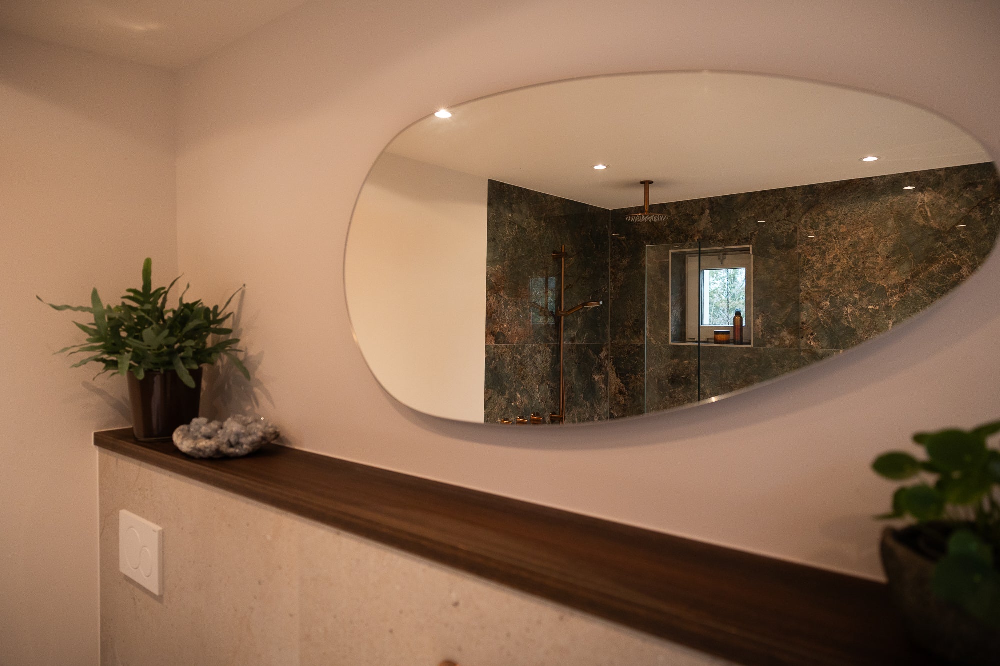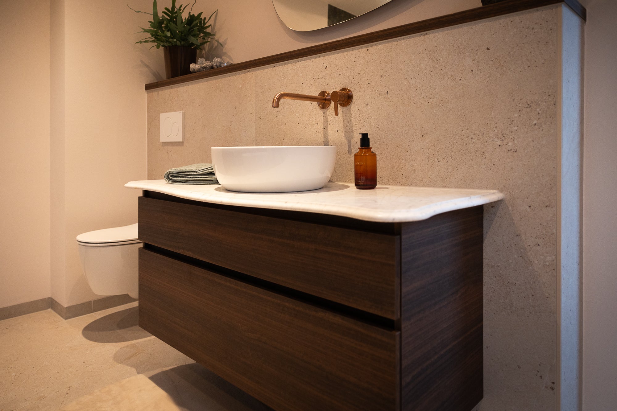 Het wastafelmeubel van 1200 mm breed in de kleur Hazel Brown, combineert elegantie met praktische opbergruimte. De organisch gevormde spiegel boven het meubel geeft een speels accent en maakt het geheel compleet.