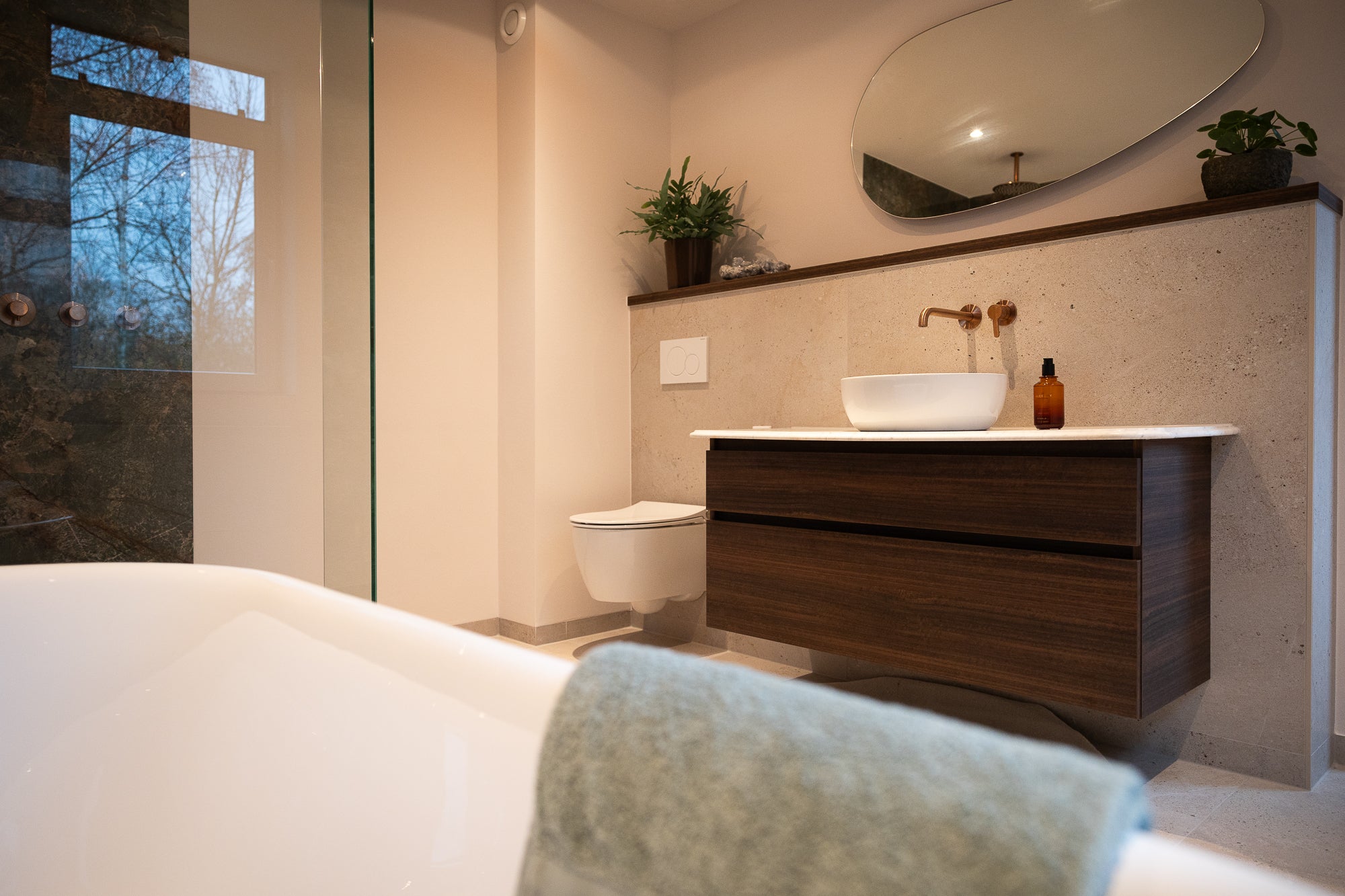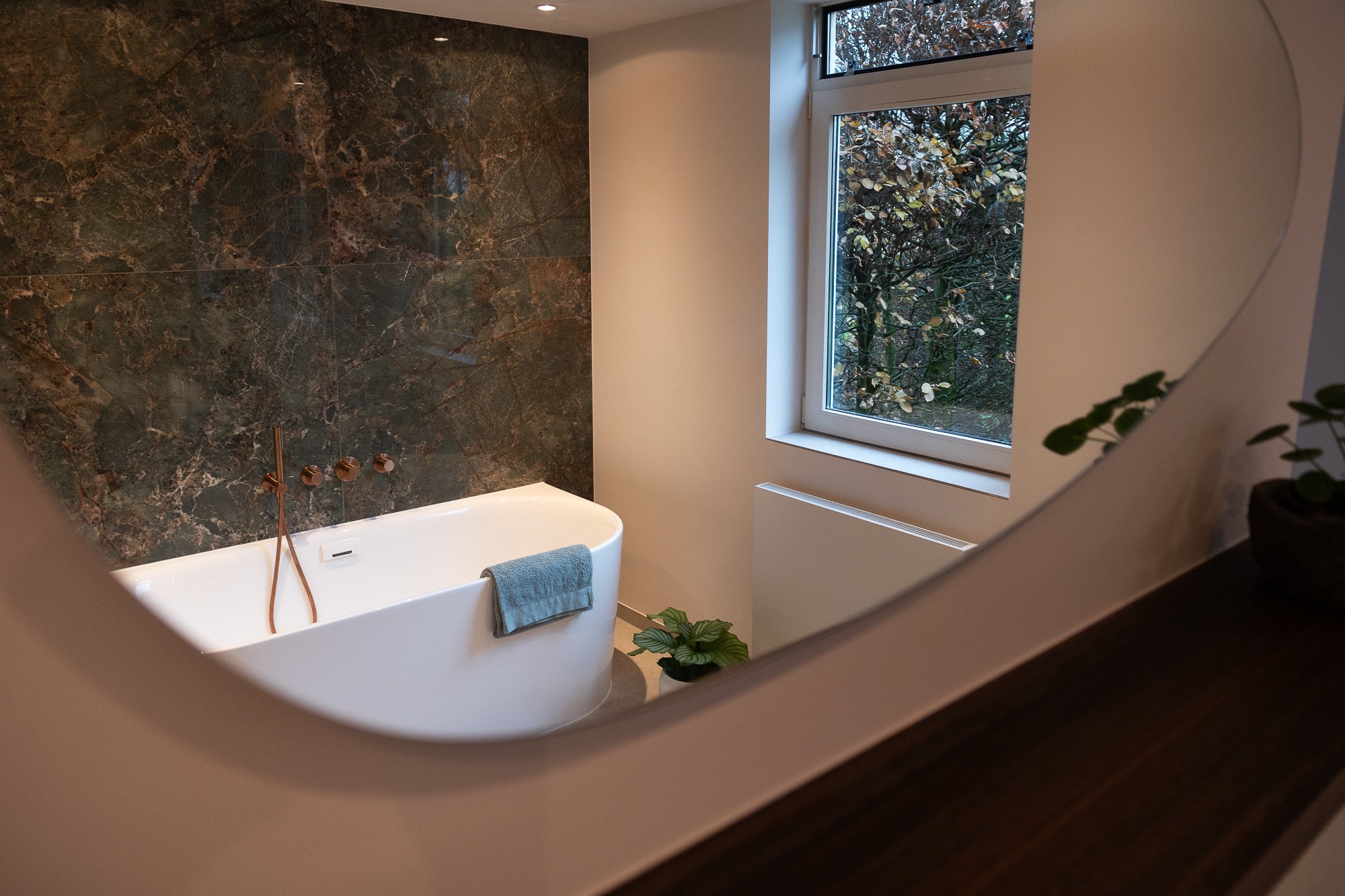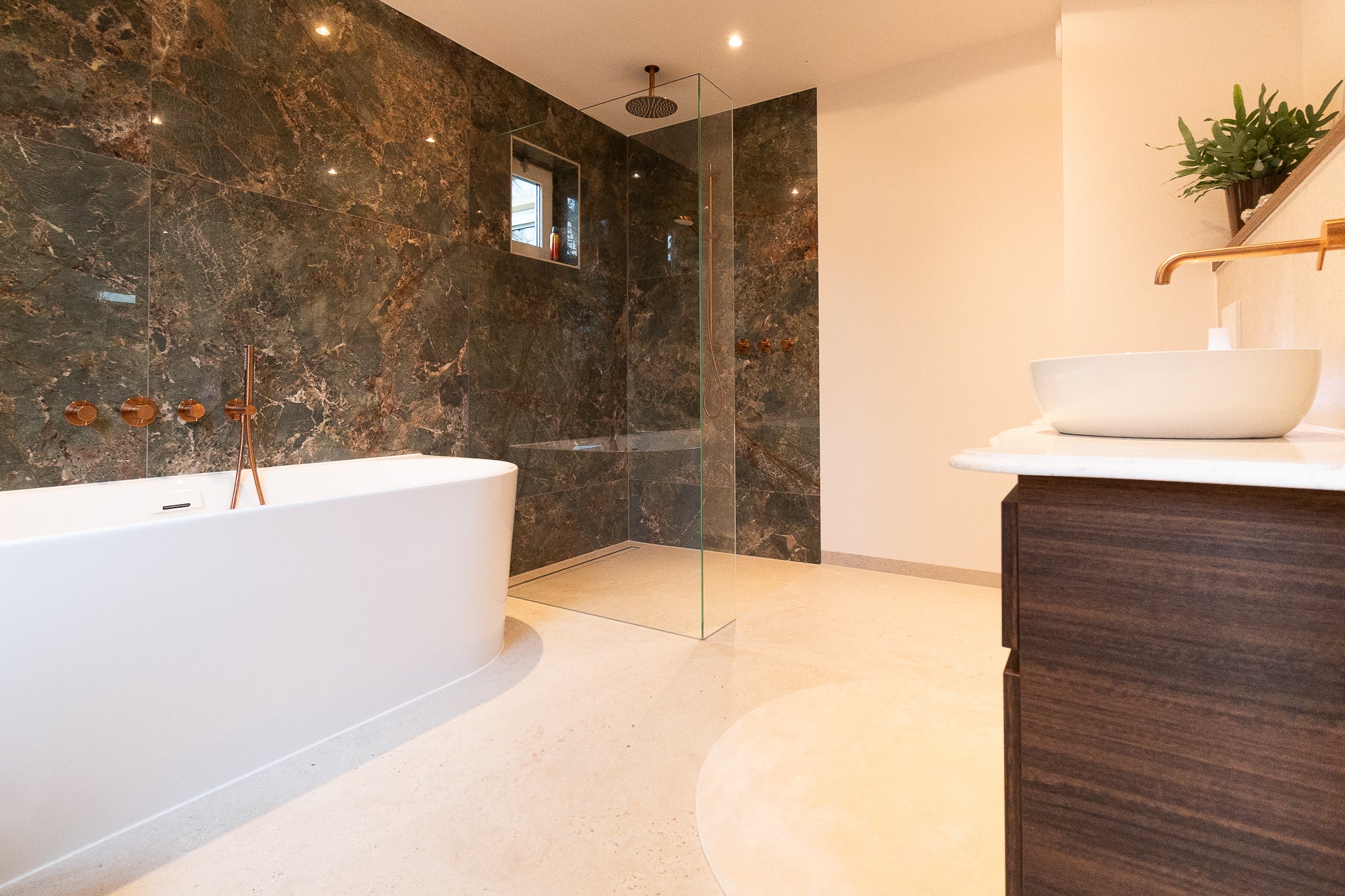 Het Xenz half vrijstaande bad vormt het hart van de badkamer. Perfect gepositioneerd voor een ruimtelijk gevoel en een ultiem moment van ontspanning. Alle kranen zijn uitgevoerd in mat koper en van het merk Damixa, wat zorgt voor een warme, luxe uitstraling die door de hele ruimte terugkomt.