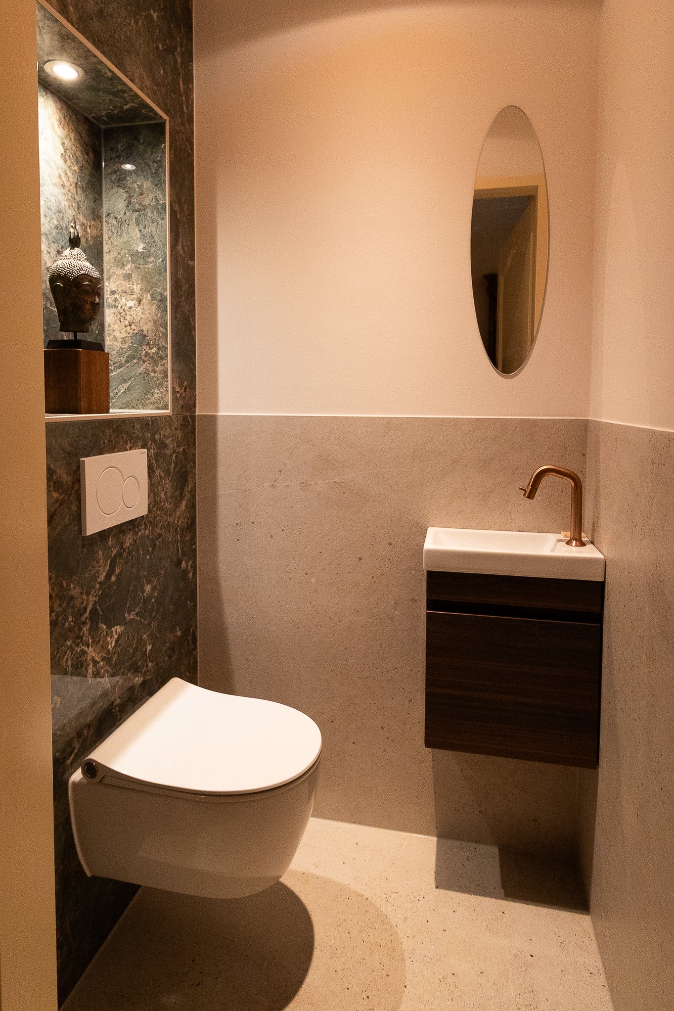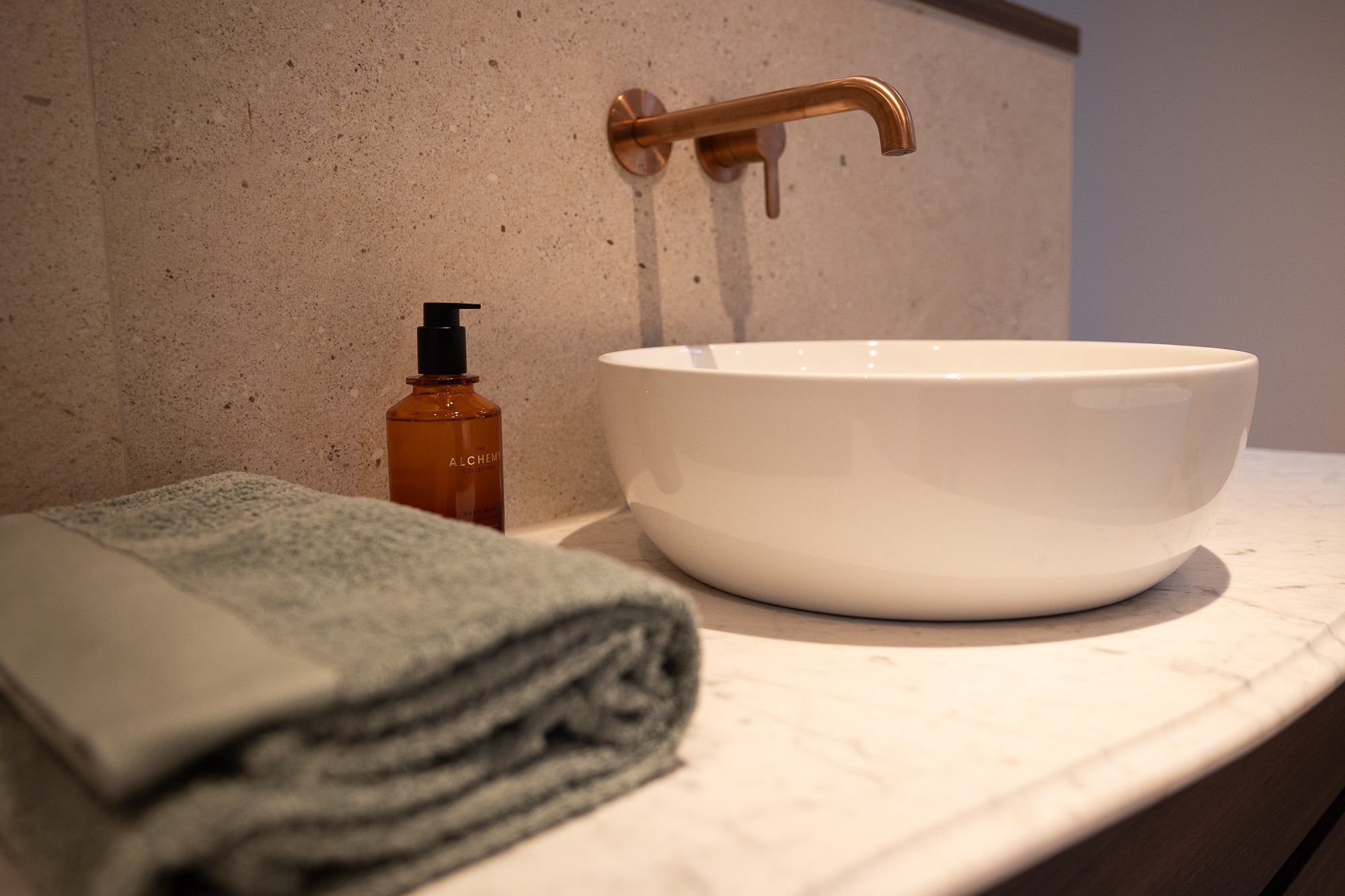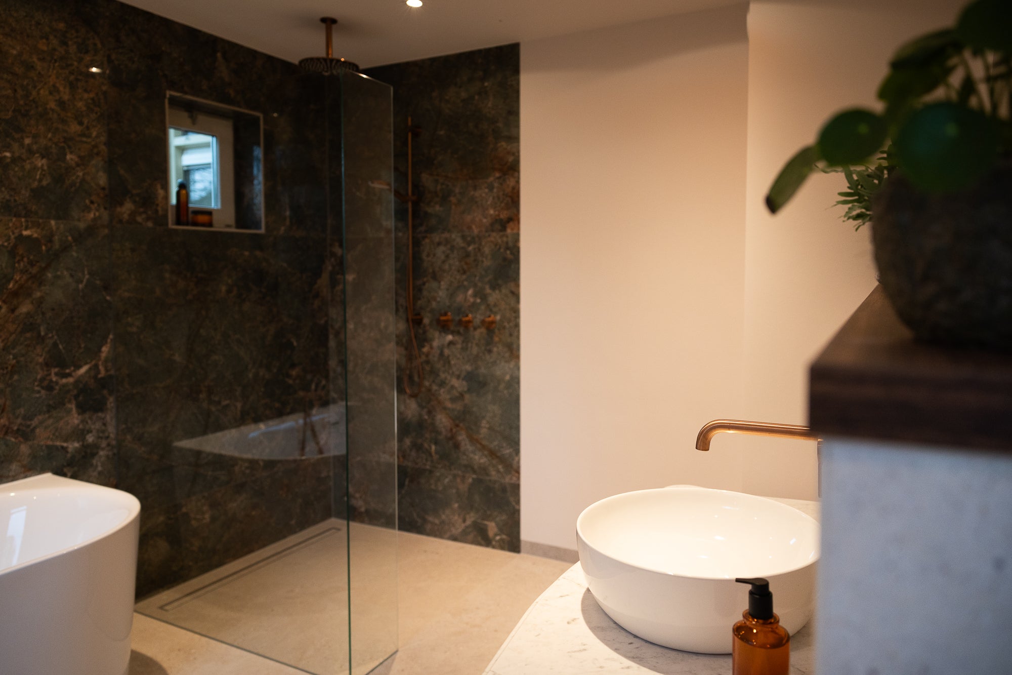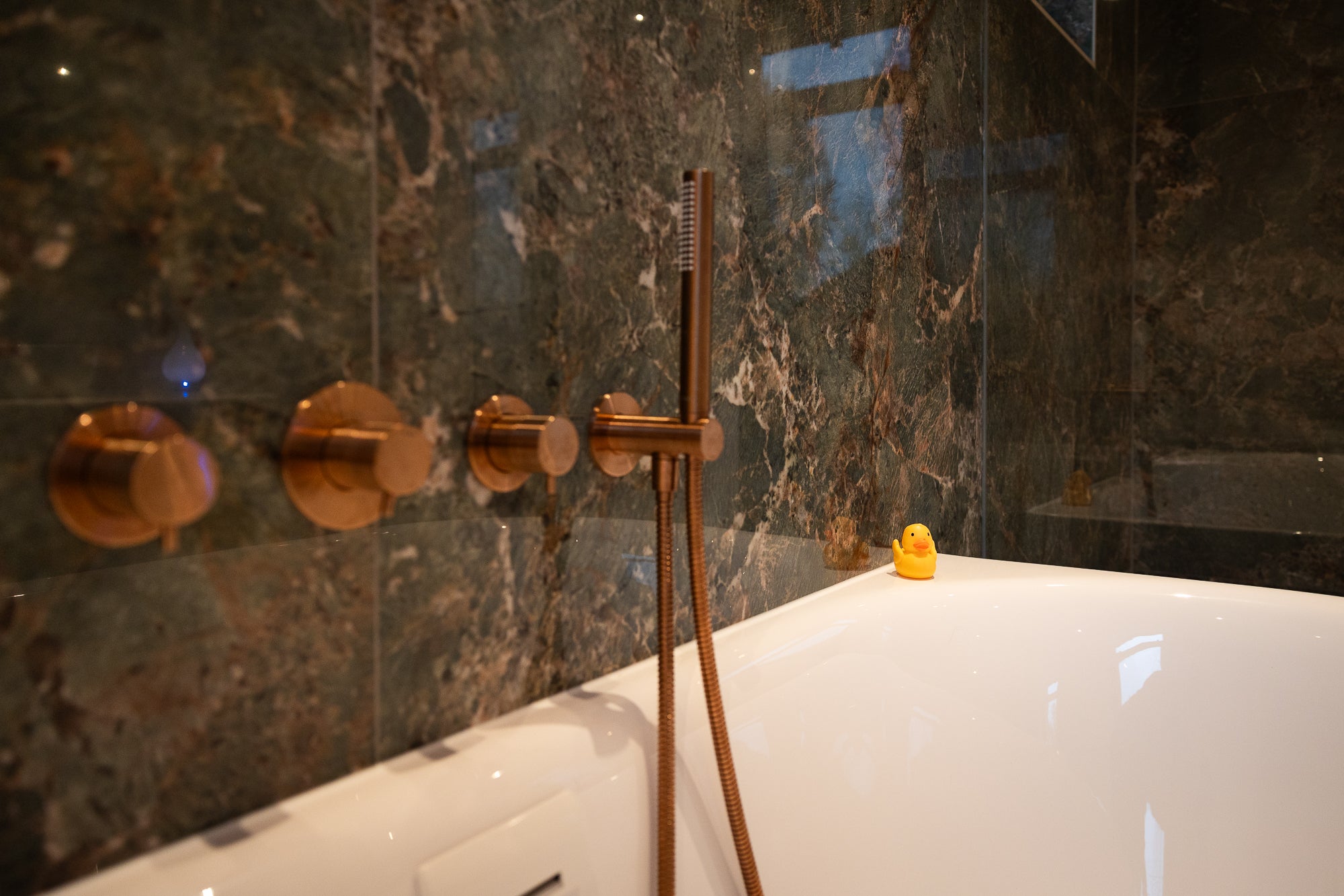 Het Xenz half vrijstaande bad vormt het hart van de badkamer. Perfect gepositioneerd voor een ruimtelijk gevoel en een ultiem moment van ontspanning. Alle kranen zijn uitgevoerd in mat koper en van het merk Damixa, wat zorgt voor een warme, luxe uitstraling die door de hele ruimte terugkomt.