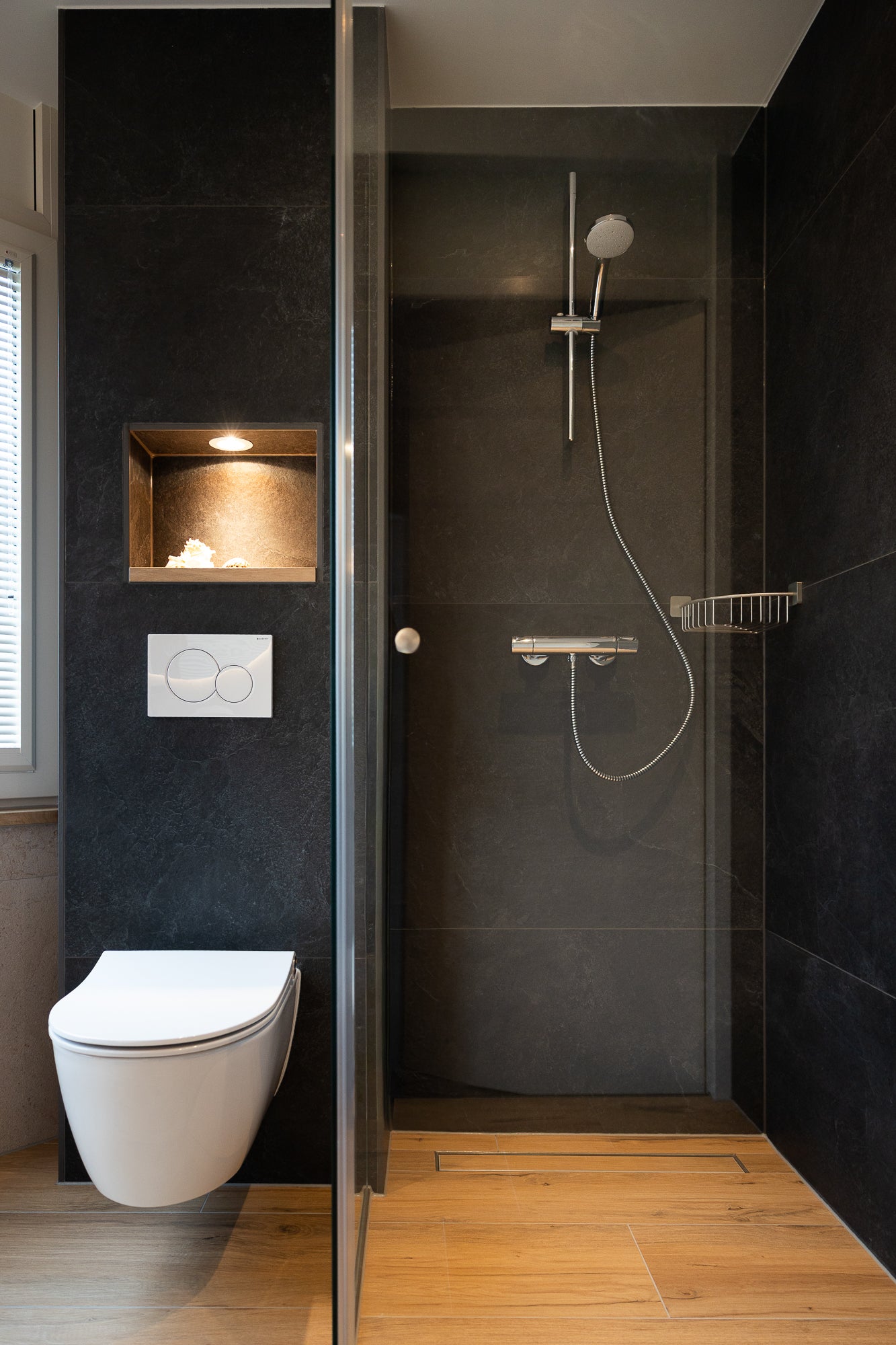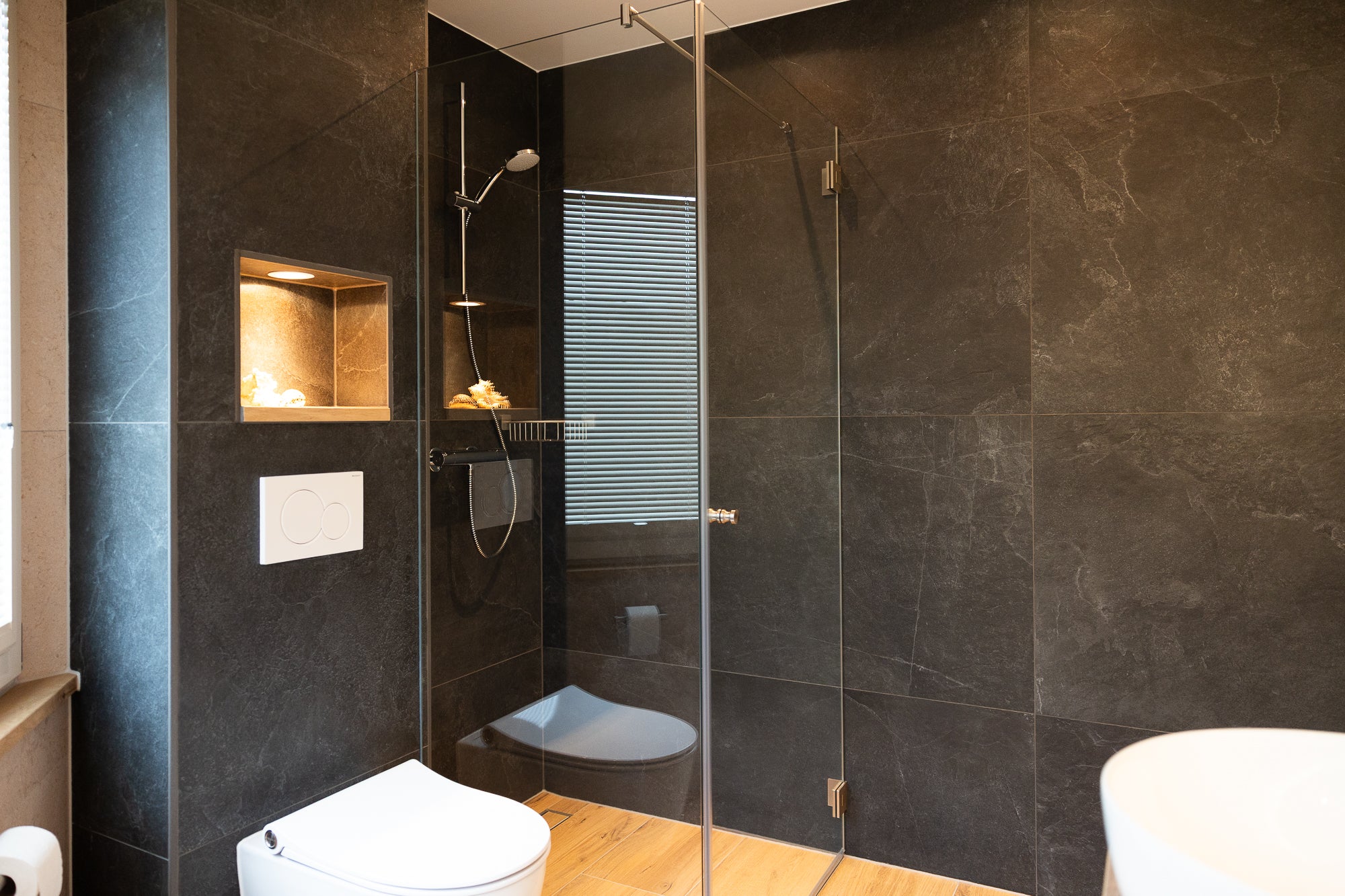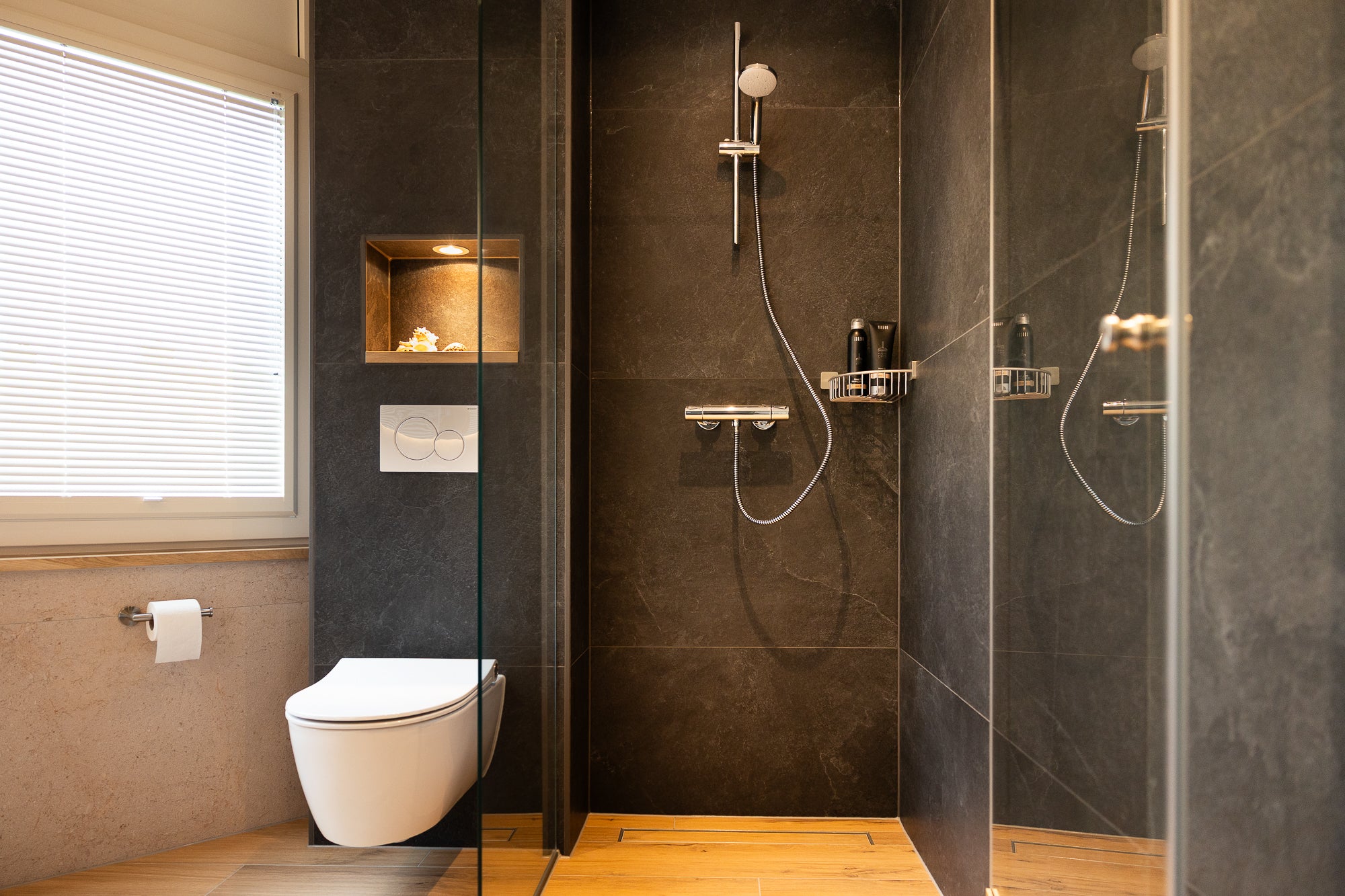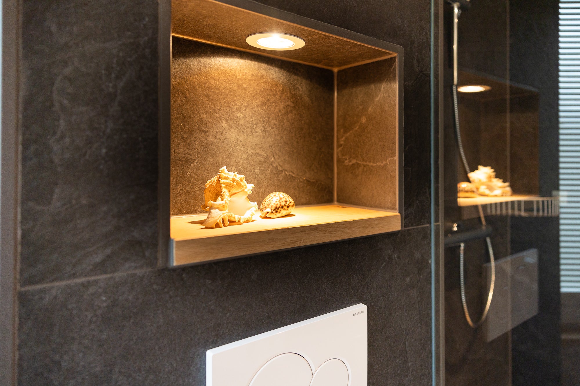 Het hart van de badkamer wordt gevormd door de ruime douche met RVS douchekraan en transparante glazen deur. De wanden zijn betegeld met donkere wandtegels die een moderne en luxe uitstraling geven. Direct naast de douche bevindt zich het hangend toilet met geïntegreerd nisje met sfeerverlichting.