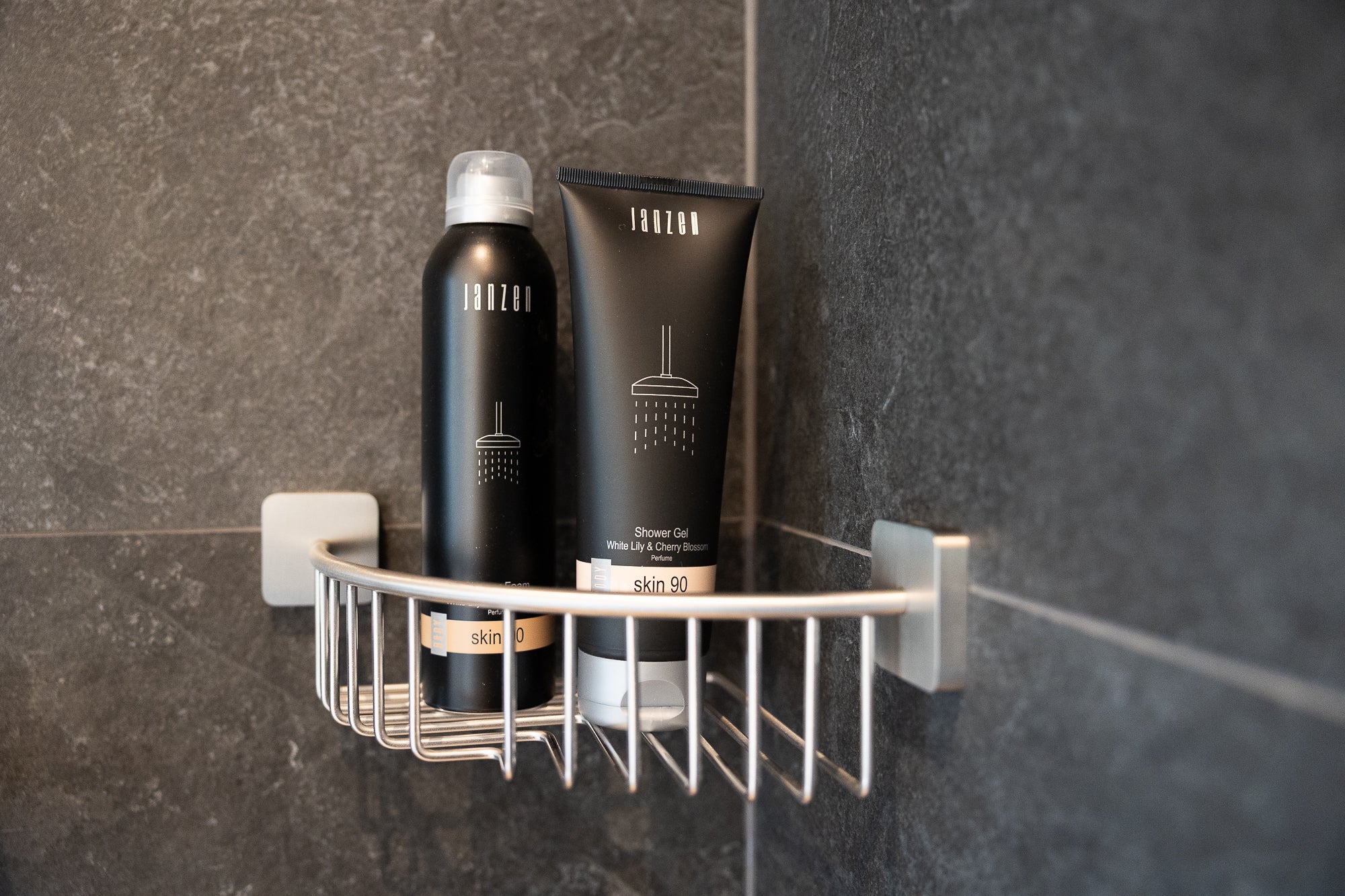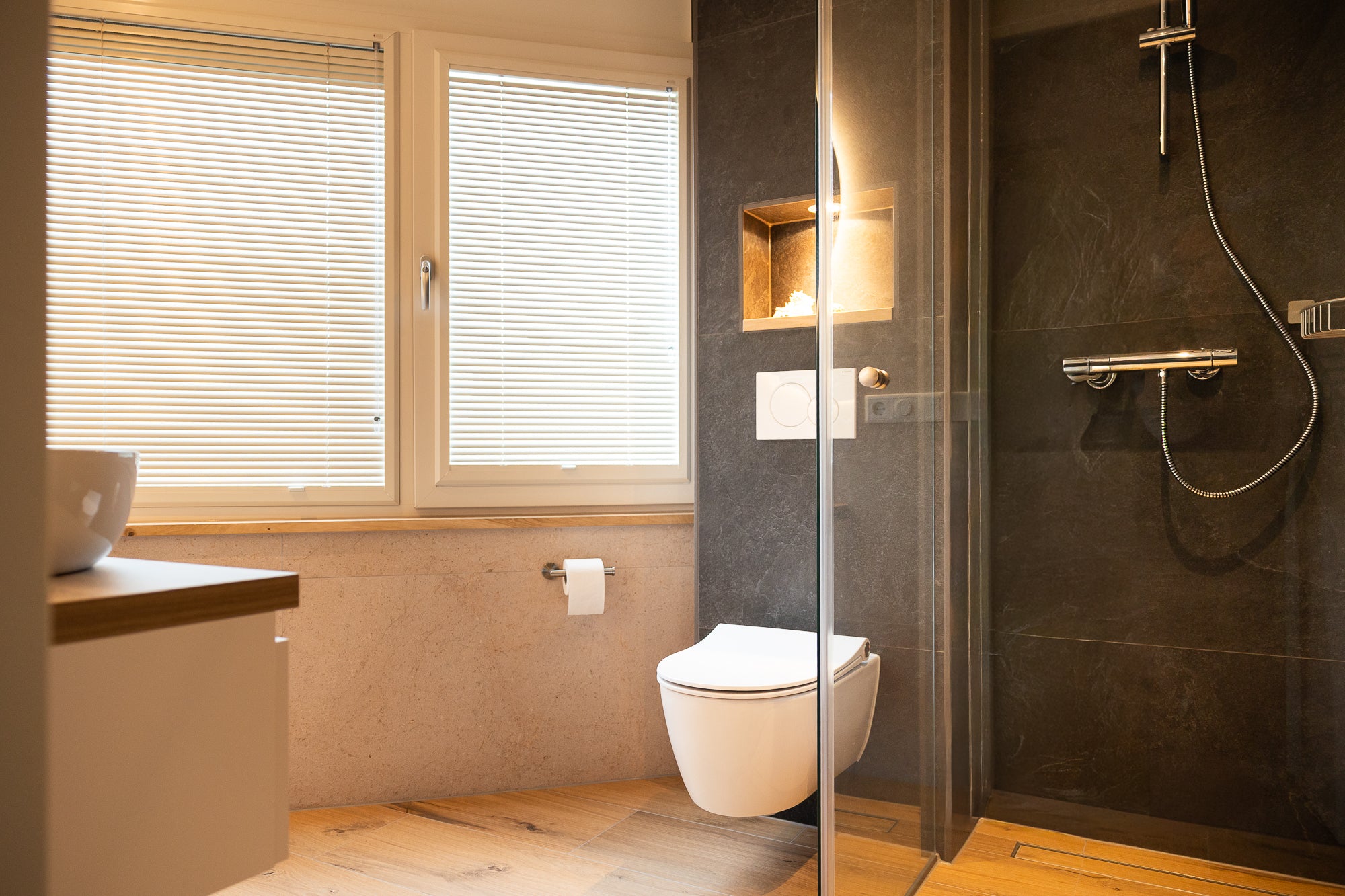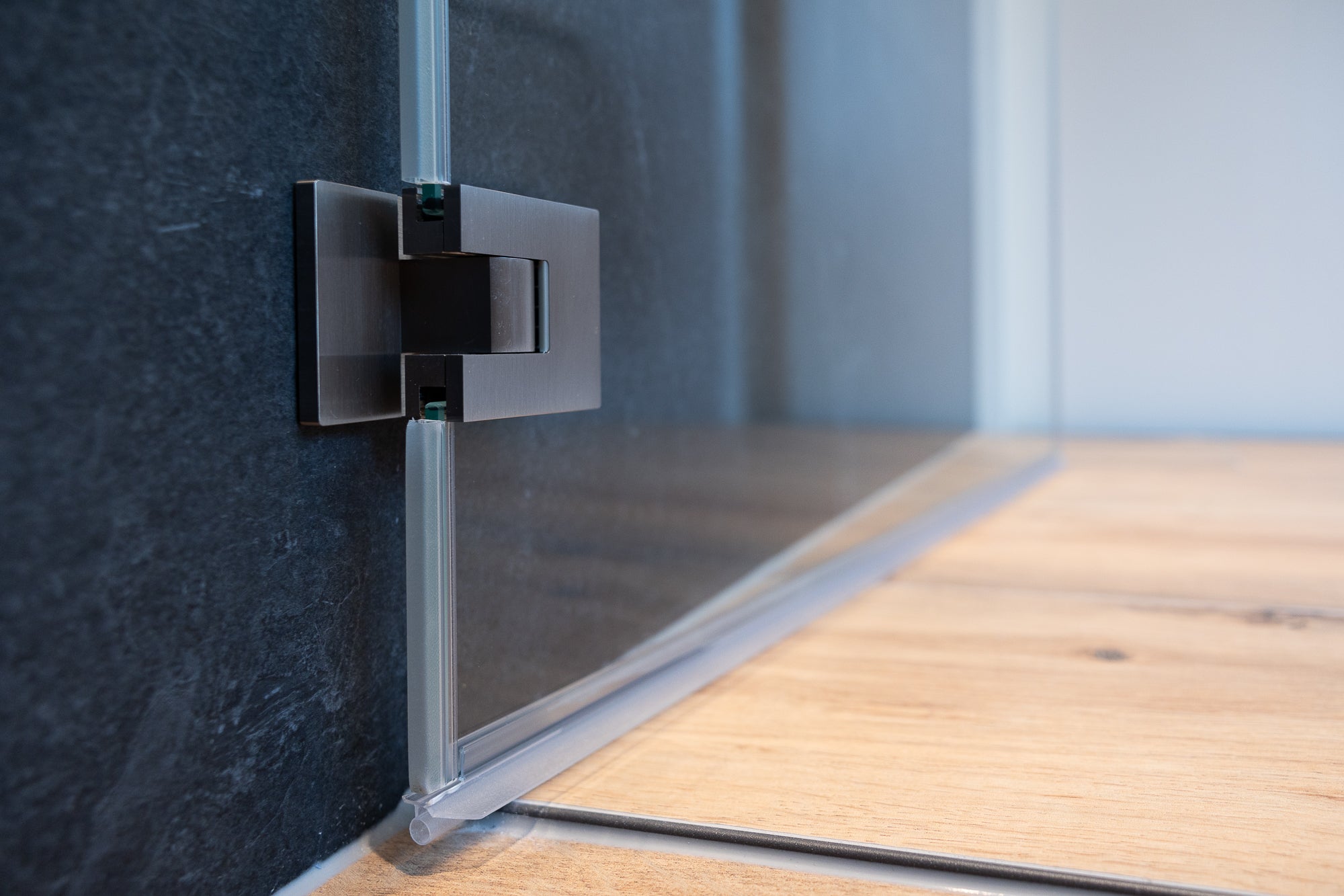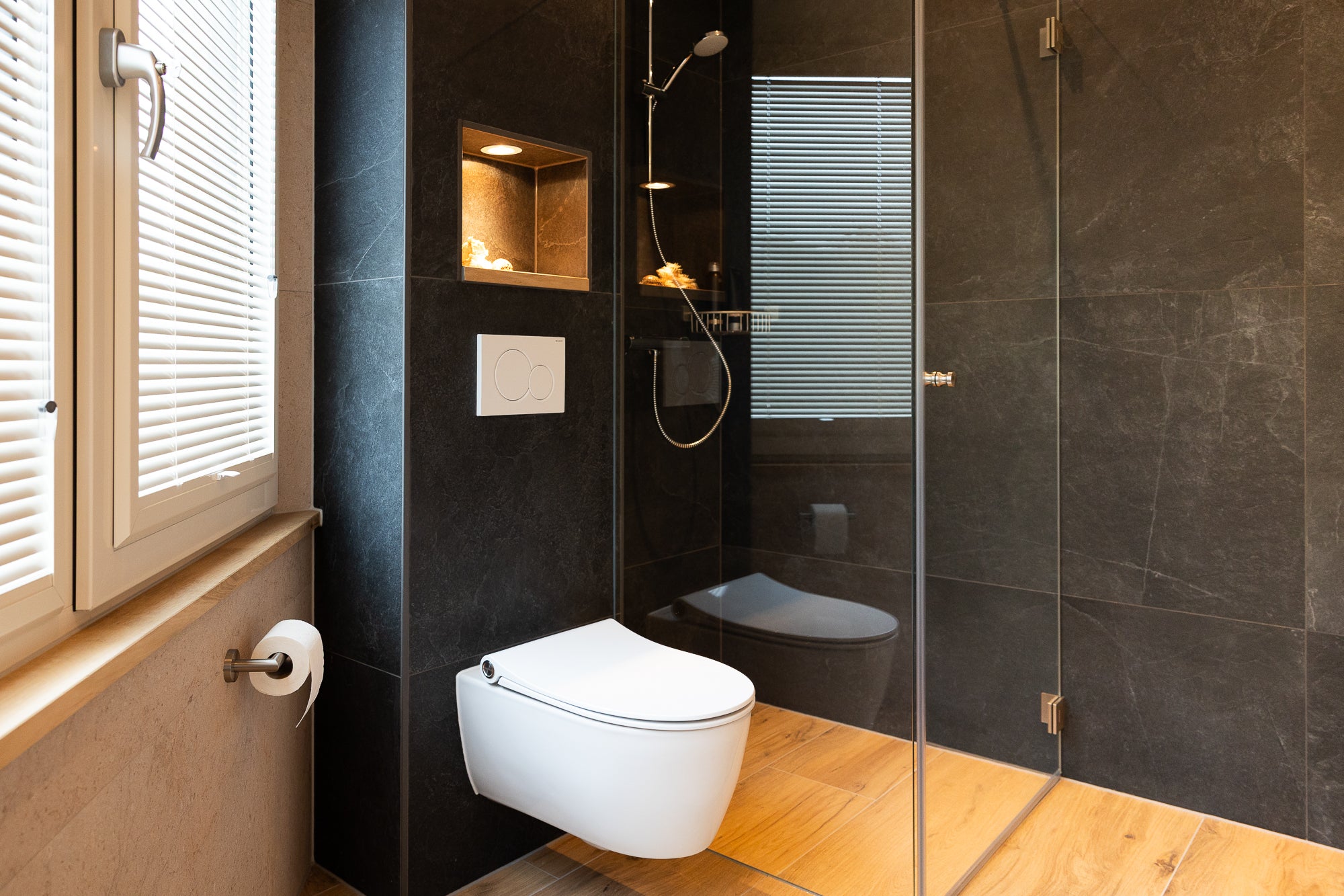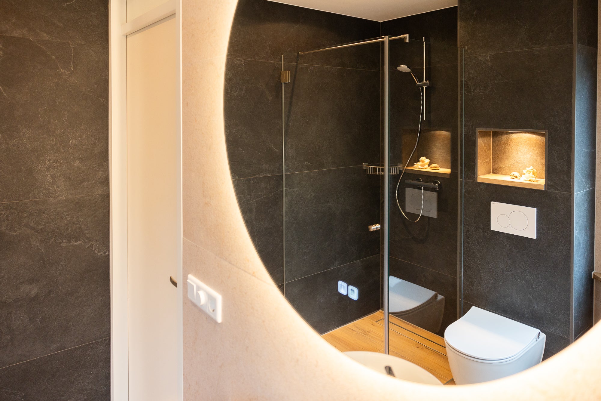 Het hart van de badkamer wordt gevormd door de ruime douche met RVS douchekraan en transparante glazen deur. De wanden zijn betegeld met donkere wandtegels die een moderne en luxe uitstraling geven. Direct naast de douche bevindt zich het hangend toilet met geïntegreerd nisje met sfeerverlichting.