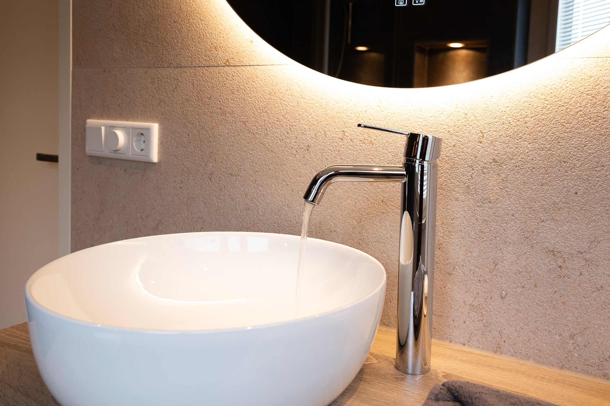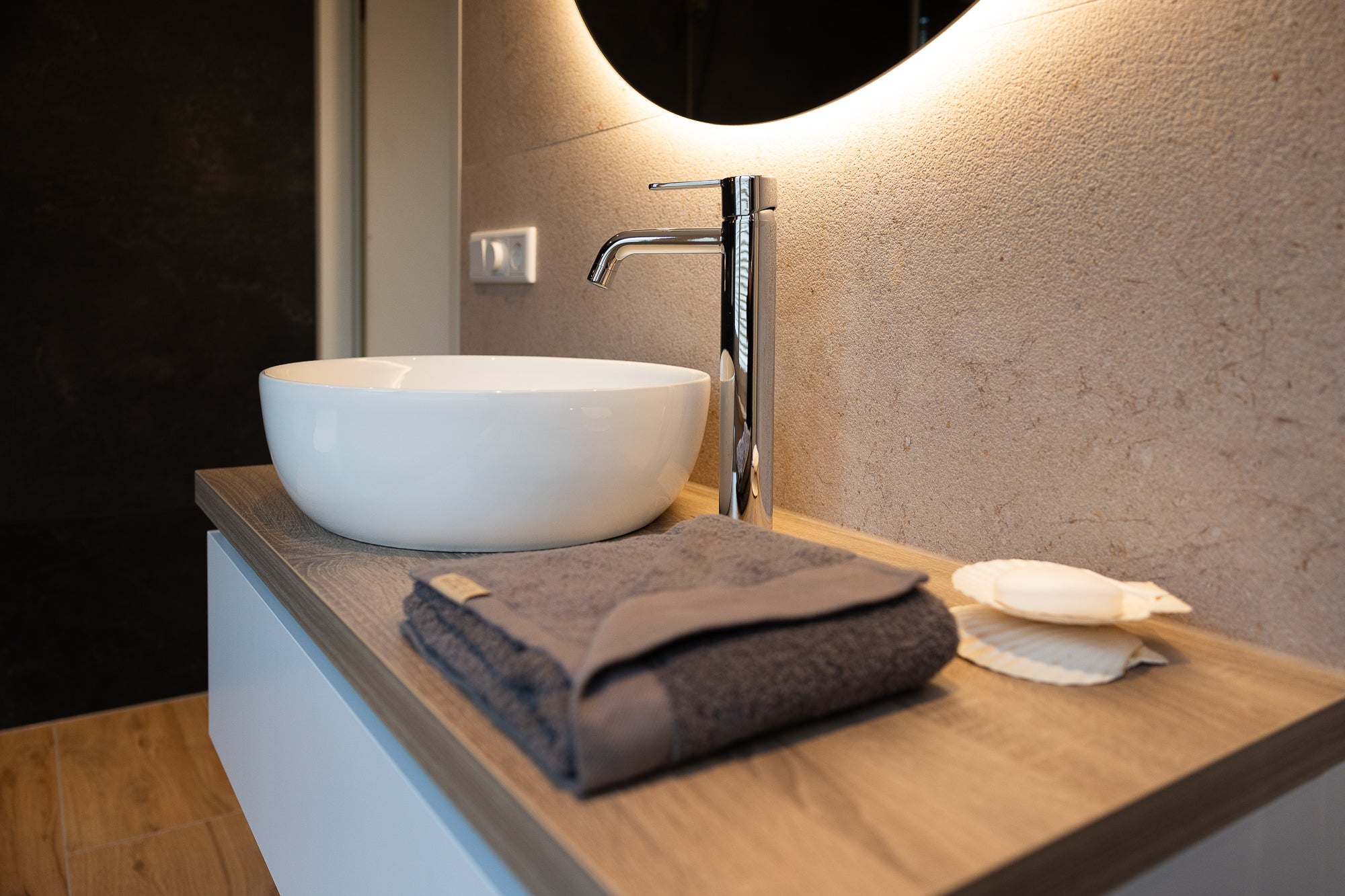 De ronde, witte waskom met RVS kraan op het moderne wasmeubel met lade oogt strak en praktisch. Met genoeg opbergruimte voor al uw spullen. De grote ronde spiegel is voorzien van verlichting en verwarming zodat deze niet beslaat tijdens het douchen.