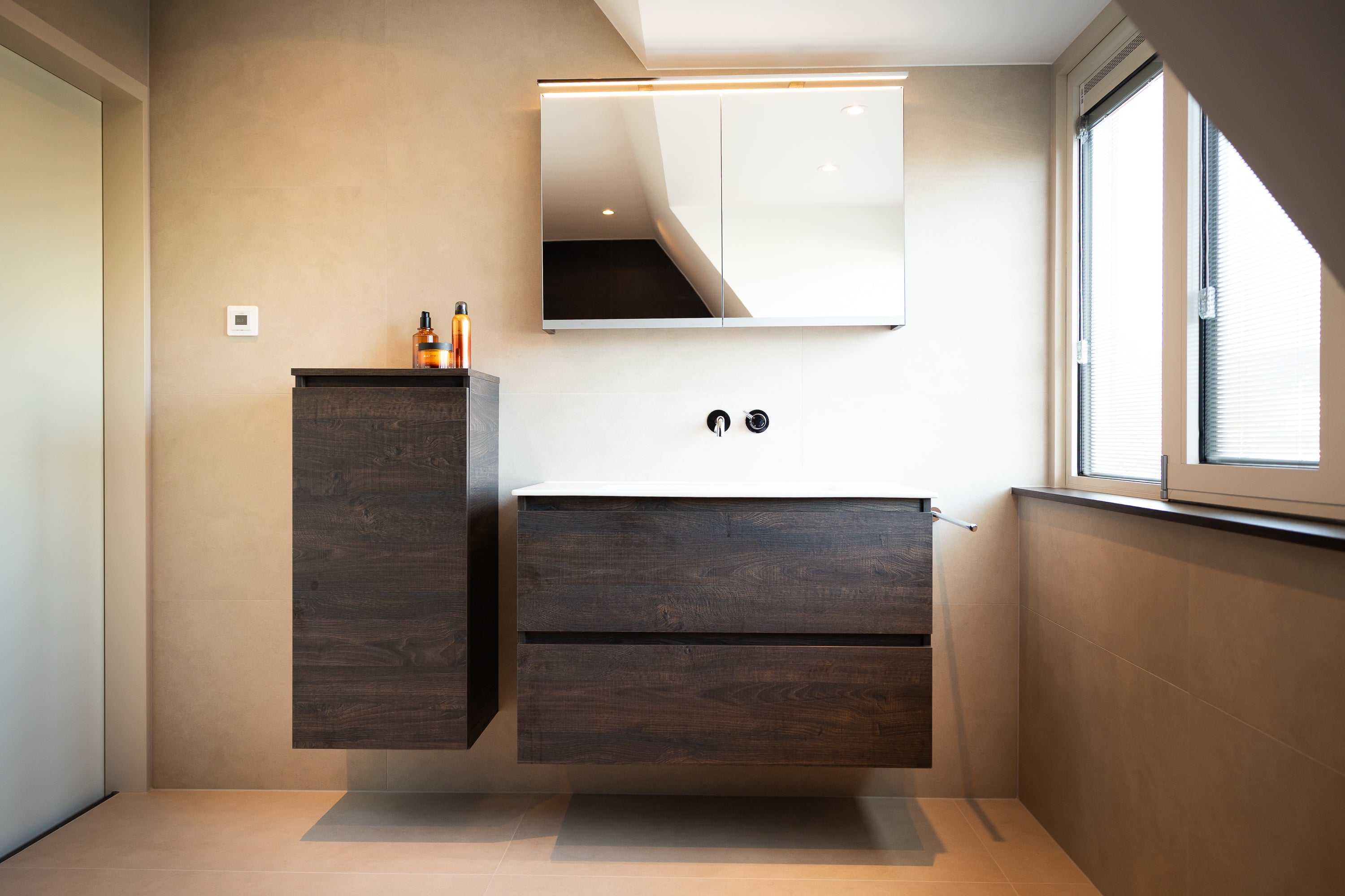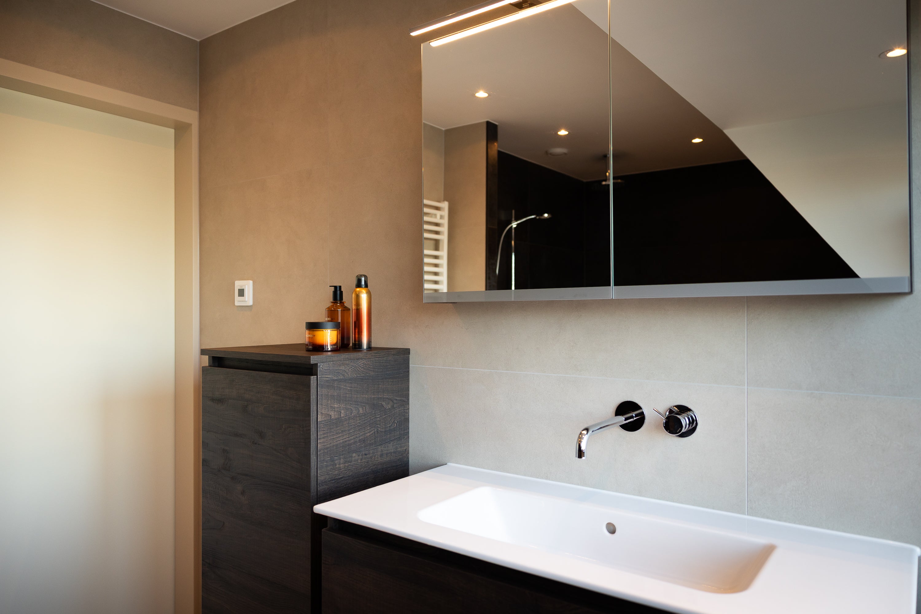 Deze badkamer straalt rust, comfort en vakmanschap uit. Elk detail is met zorg gekozen om een harmonieus geheel te creëren, waarin functionaliteit en design elkaar versterken.