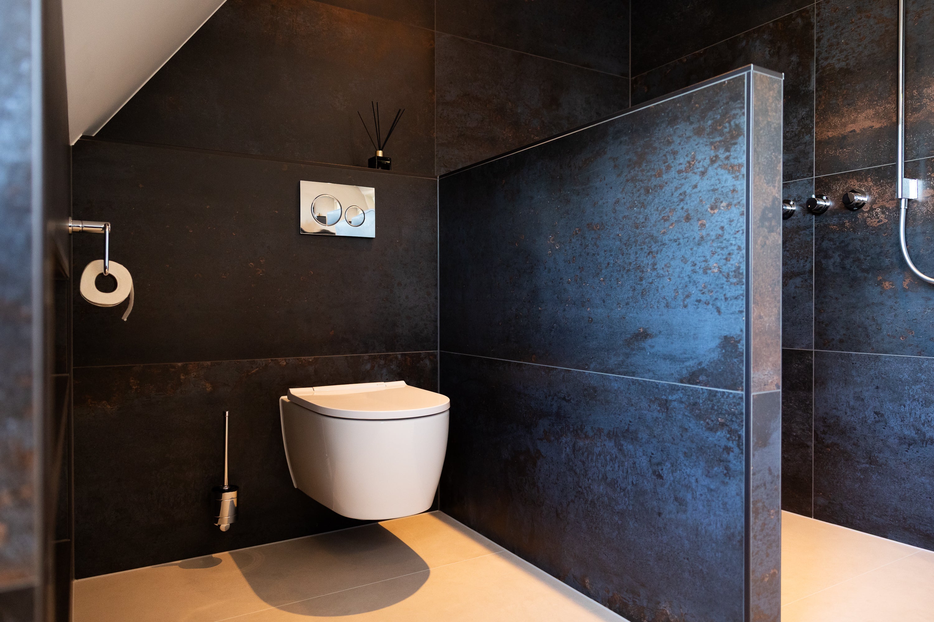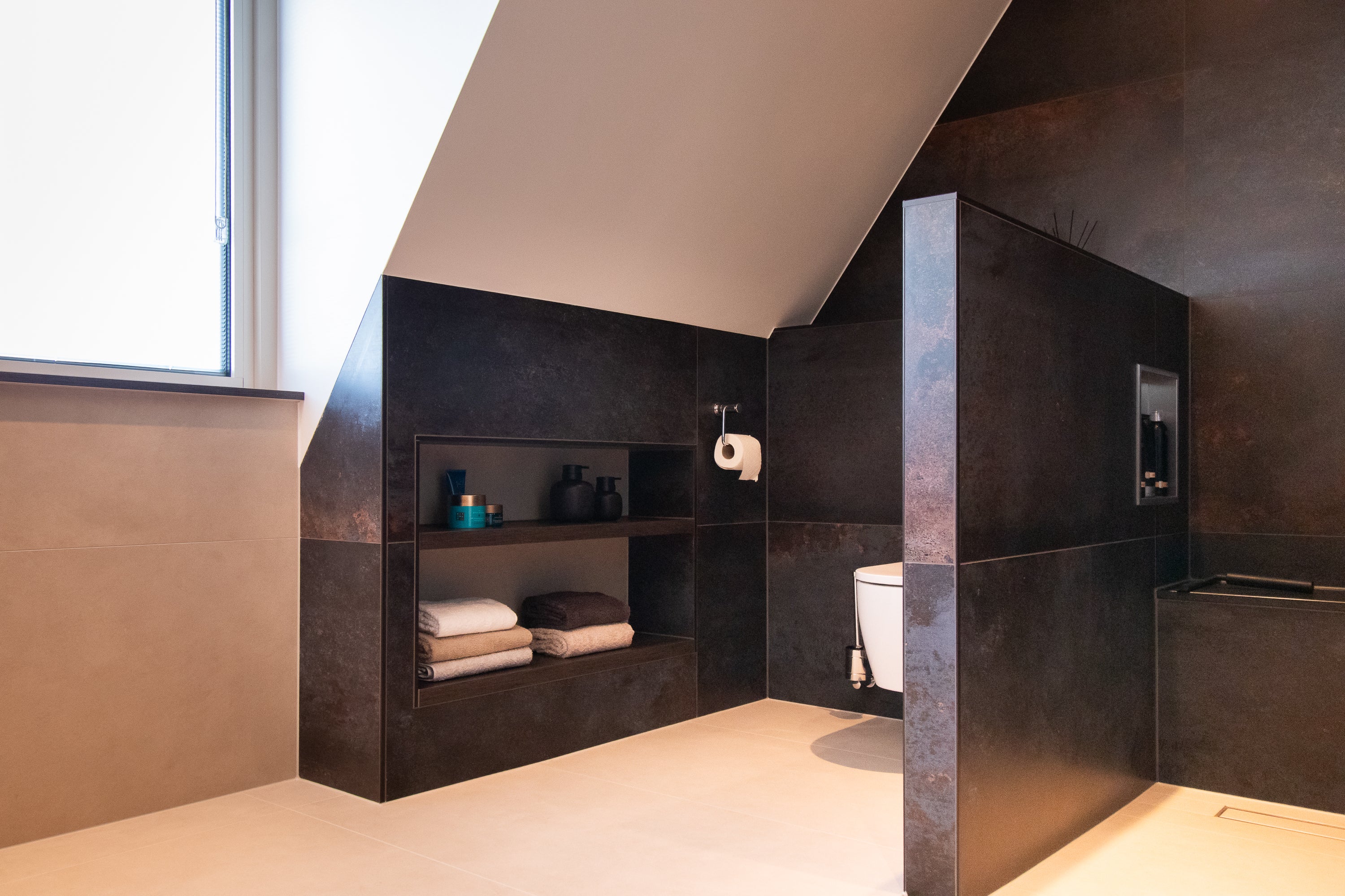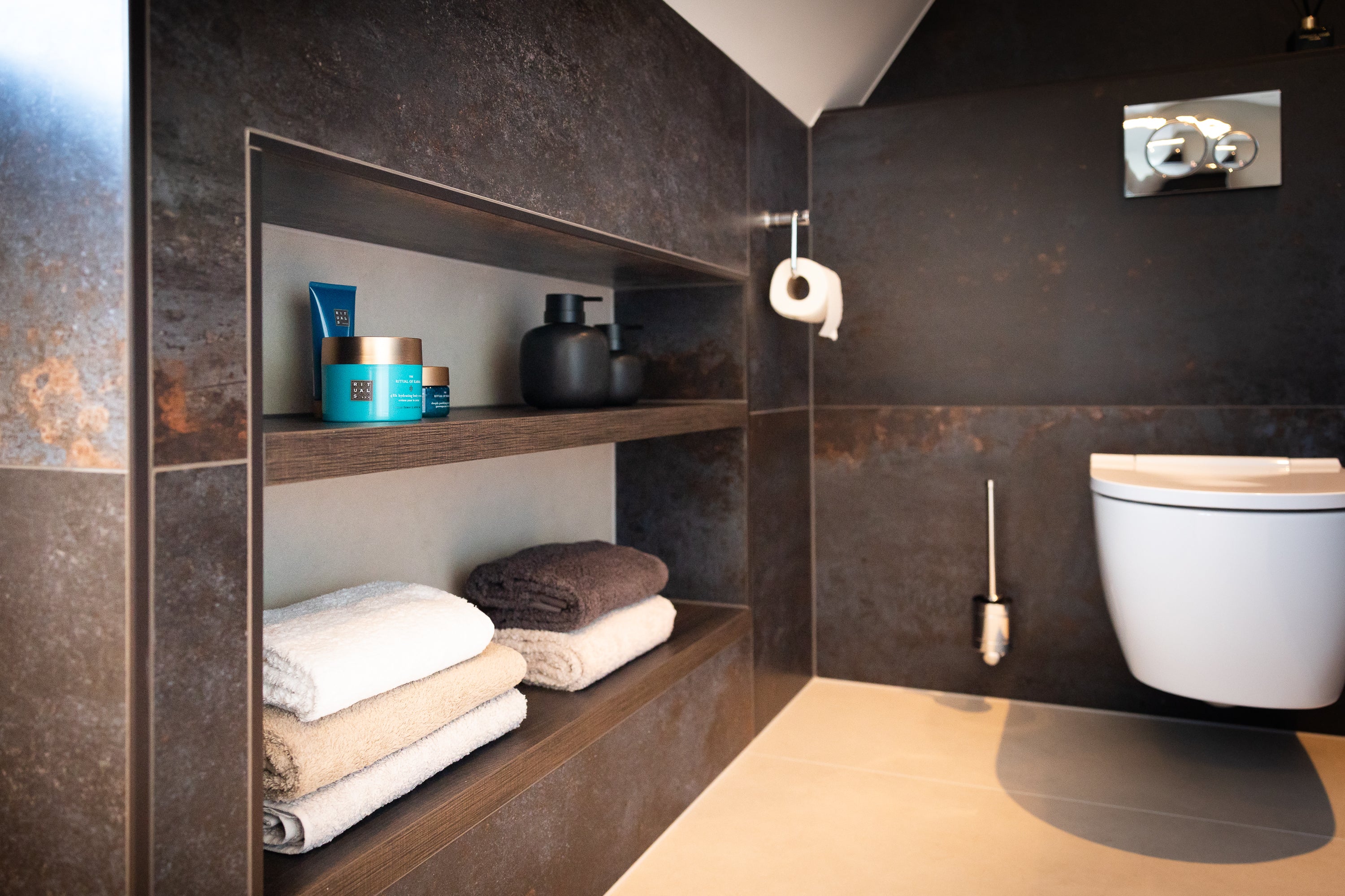 Zelfs de accessoires zijn zorgvuldig gekozen: Damixa handdoekrail, toiletrolhouder en andere details maken het plaatje compleet.