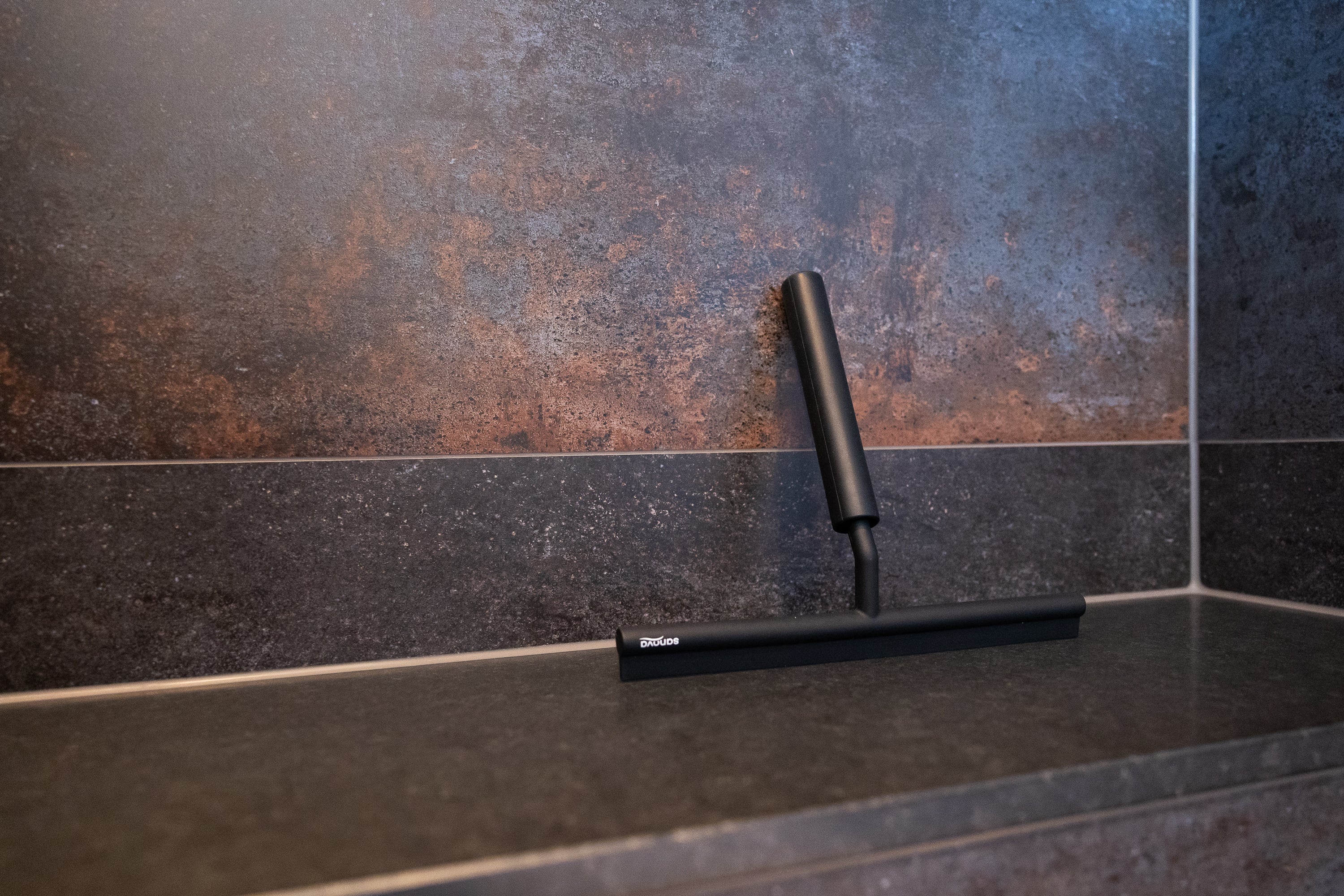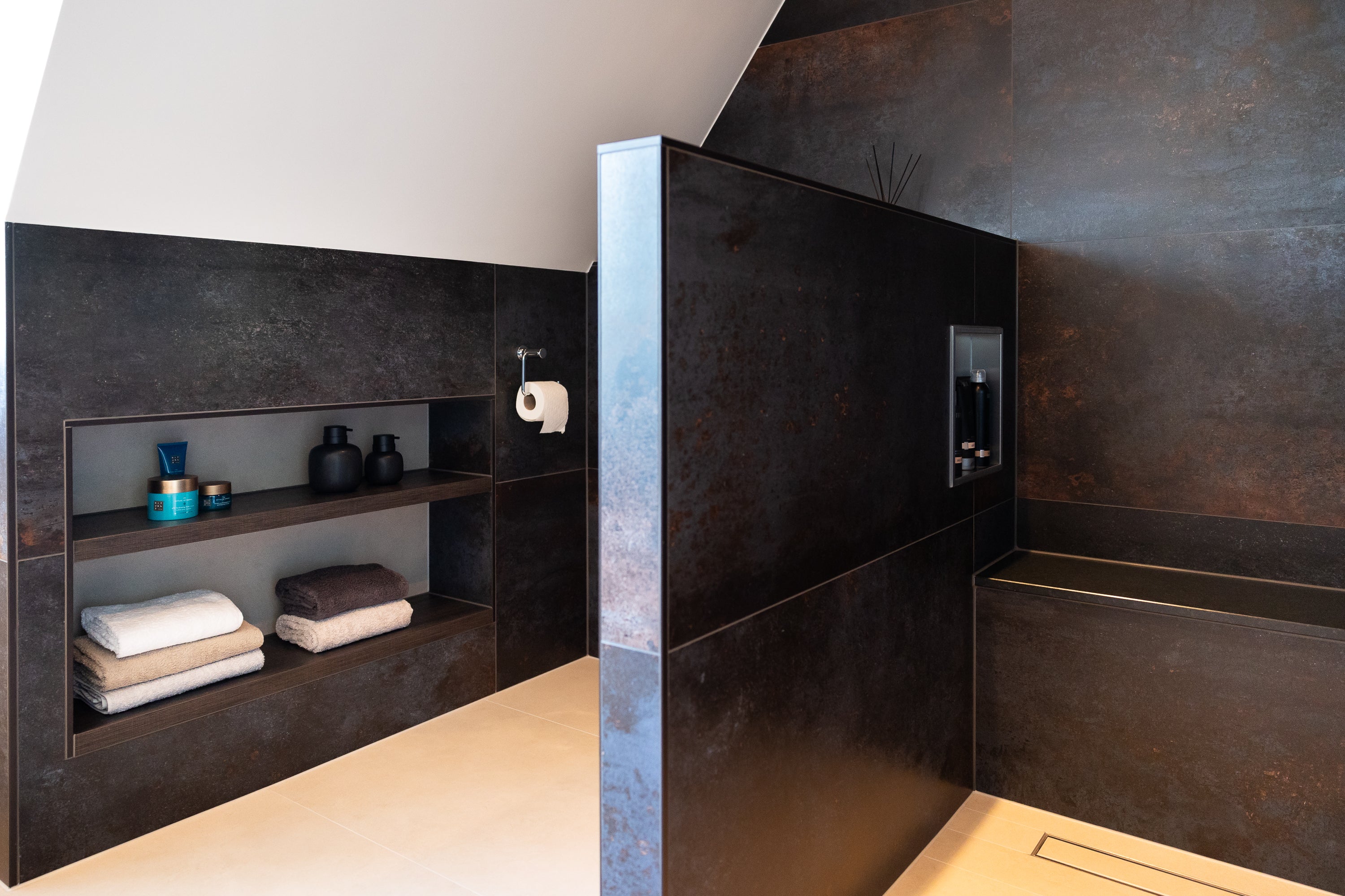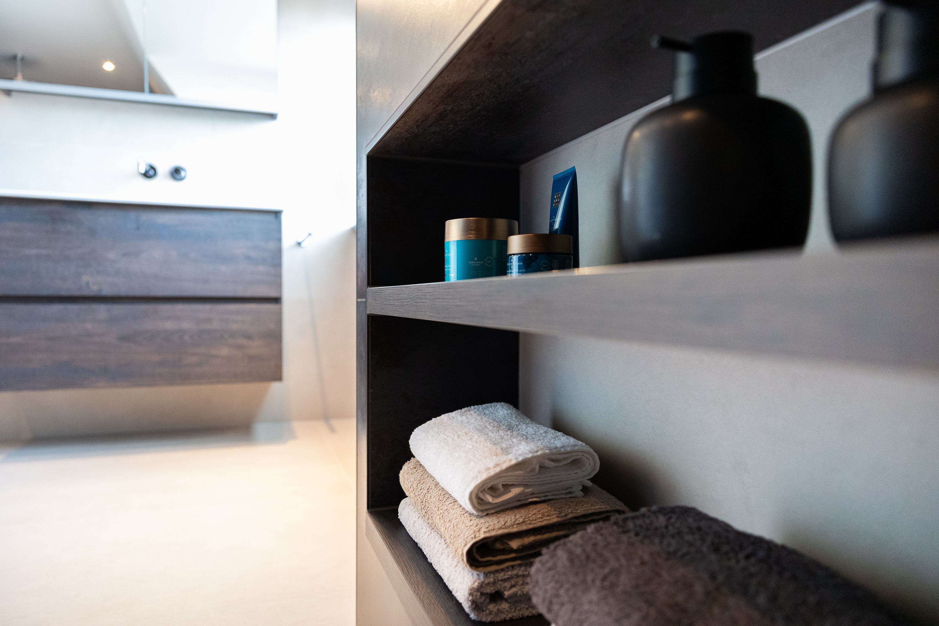 In de douche is gekozen voor een composiet plateau dat dient als douchezitje. Praktisch, hygiënisch en naadloos passend bij de rest van het ontwerp. De inbouwspotjes in het plafond zorgen voor subtiele, sfeervolle verlichting die de ruimte optisch vergroot.
