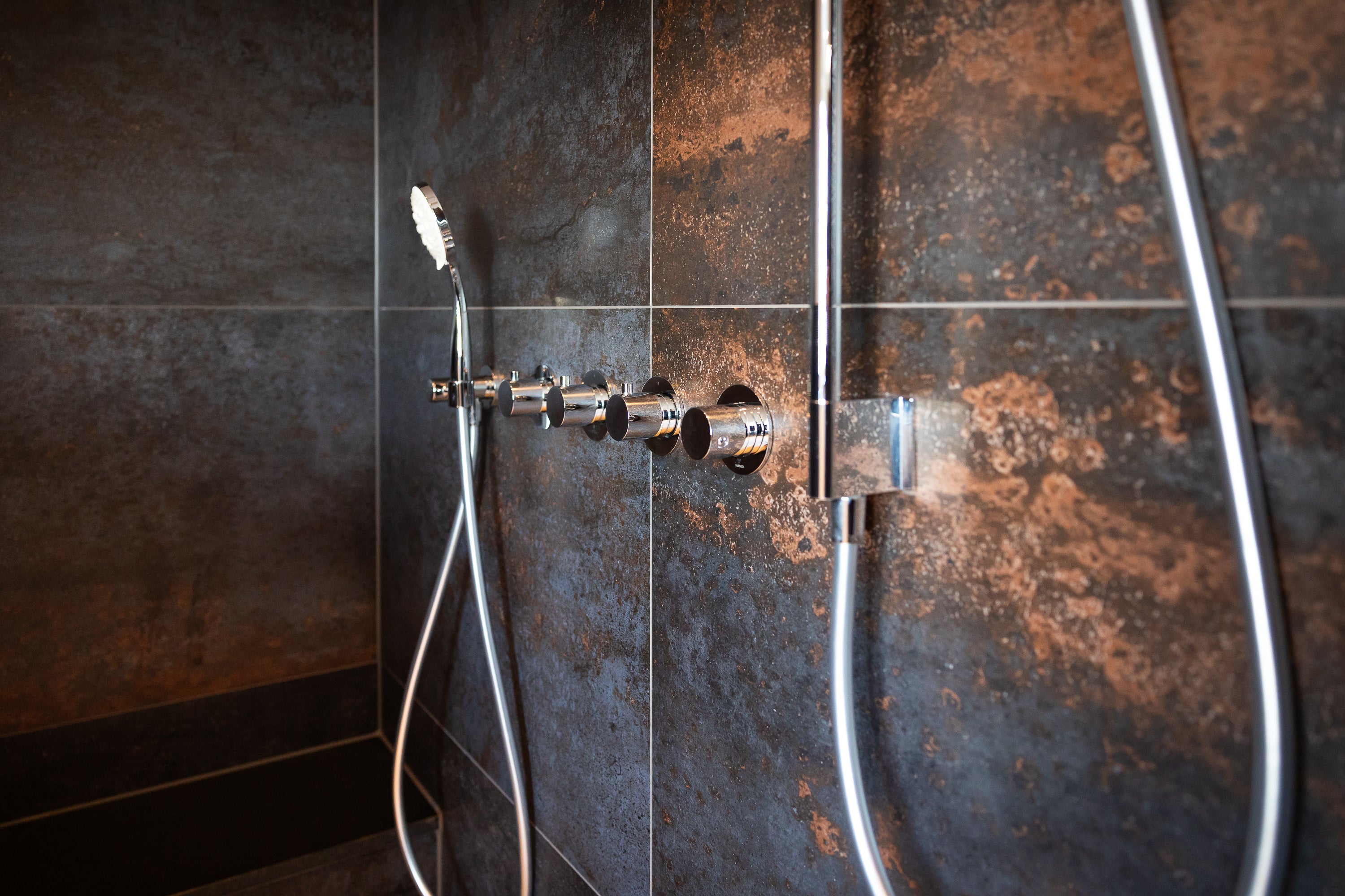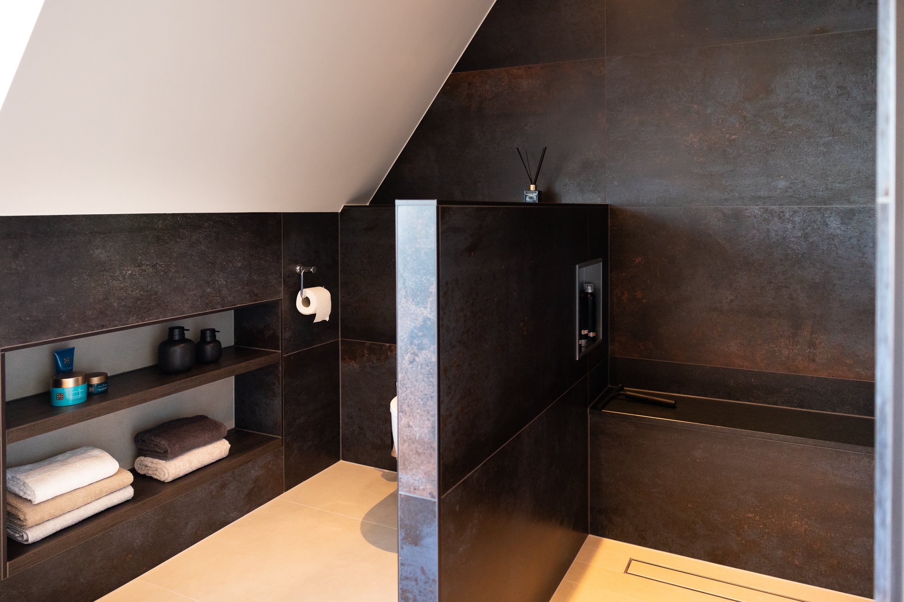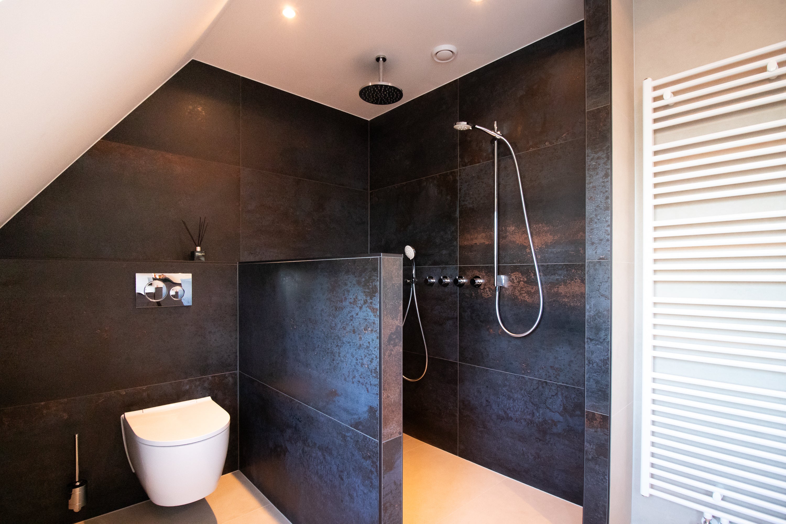 De inloopdouche is een echte blikvanger. Uitgerust met een Hotbath thermostaat, stopkranen, hoofddouche en handdouche, biedt deze douche alle luxe die u zich kunt wensen. De bediening is logisch en stijlvol geïntegreerd, zodat u optimaal geniet van elke douchebeurt. In de wand bevindt zich een Looox Box inbouwnis, ideaal voor het opbergen van shampoos en verzorgingsproducten.