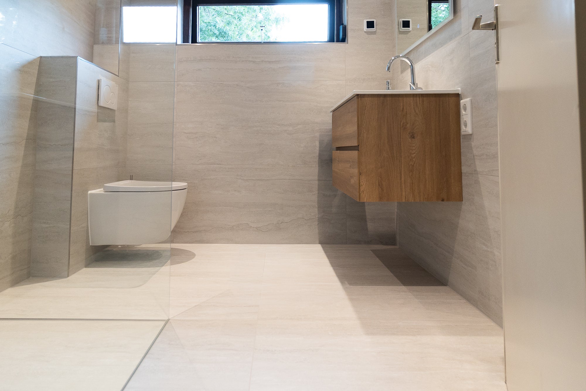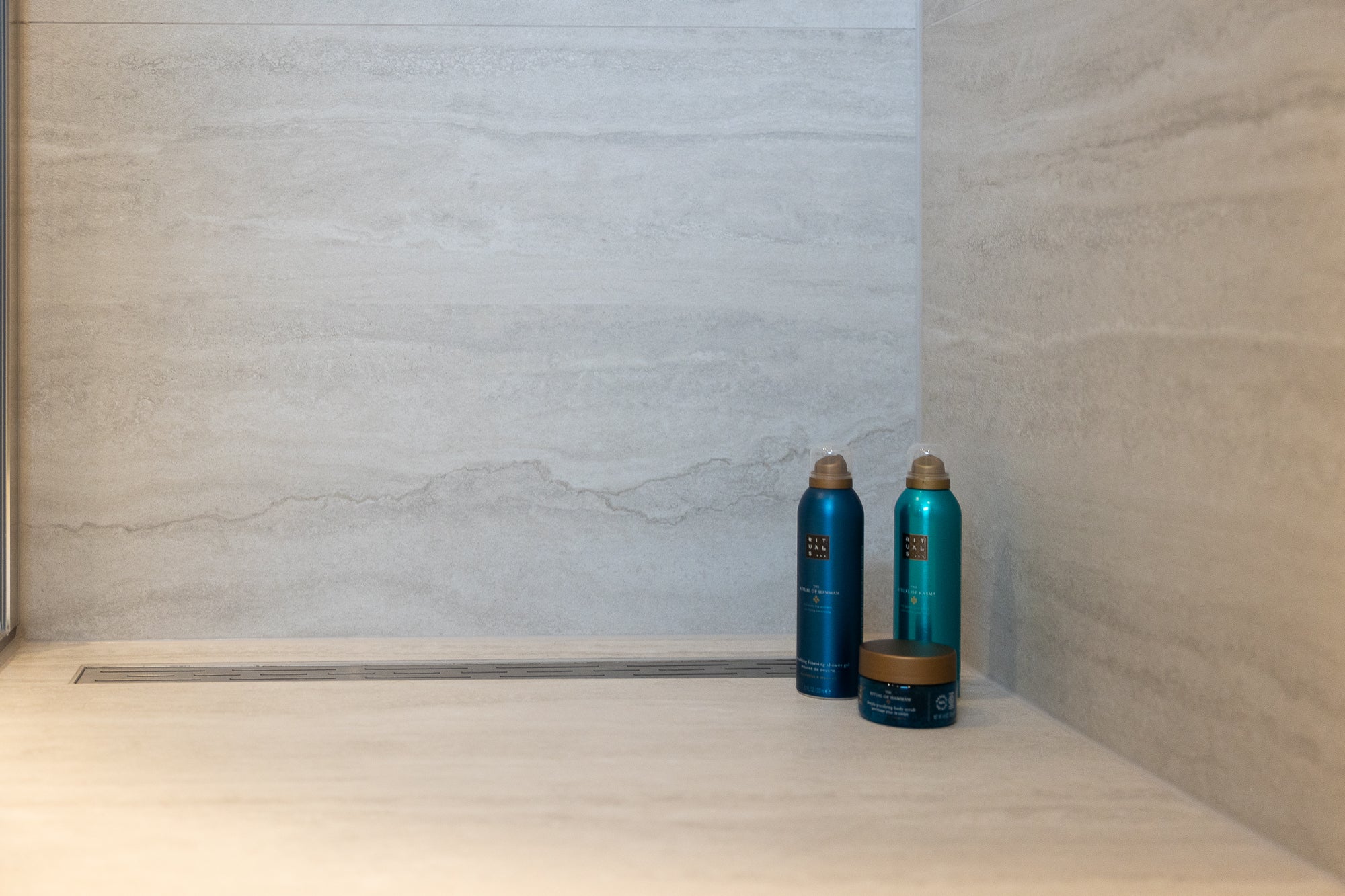 De vloer en wanden zijn bekleed met grote cremekleurige tegels met een subtiele adering. Deze natuursteenlook geeft de ruimte een tijdloos karakter. De zachte tinten brengen rust en vormen een kalme basis voor het ontwerp.