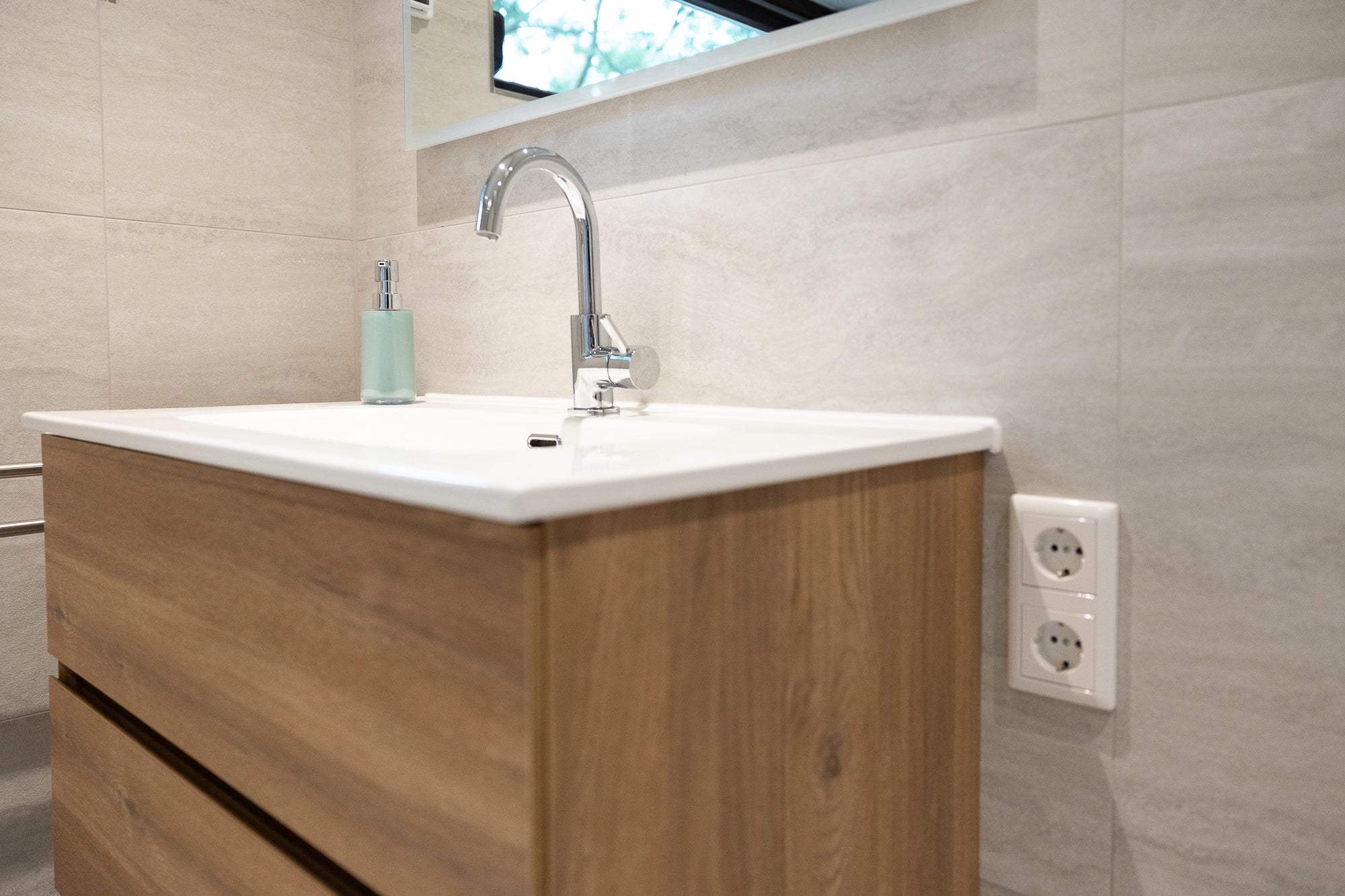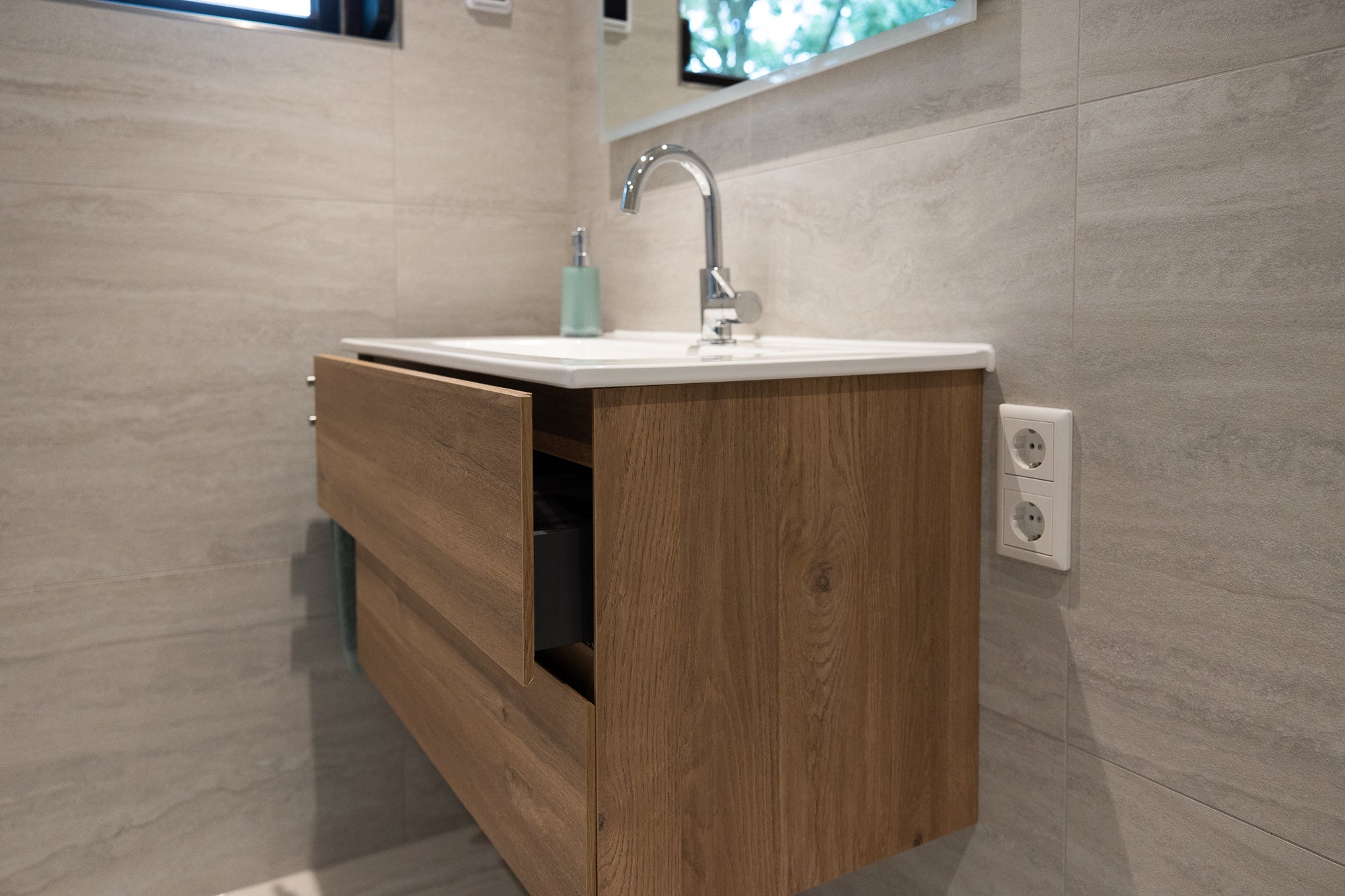 Het houten badkamermeubel voegt warmte toe en contrasteert mooi met de lichte tegels. De geïntegreerde wastafel en de strakke lijnen zorgen voor een moderne uitstraling. De ruime lades houden de badkamer opgeruimd en overzichtelijk.