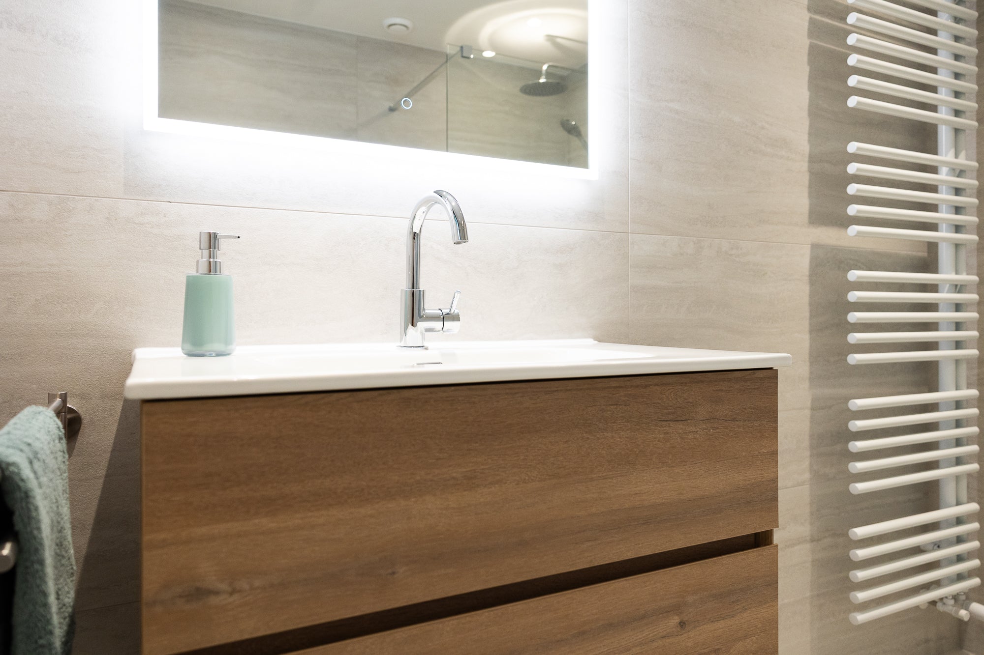 Boven het meubel hangt een grote randloze spiegel die het licht reflecteert en de ruimte optisch vergroot. Een smal horizontaal raam laat natuurlijk daglicht binnen en zorgt tegelijk voor ventilatie. Zo blijft het fris en licht in de ruimte.