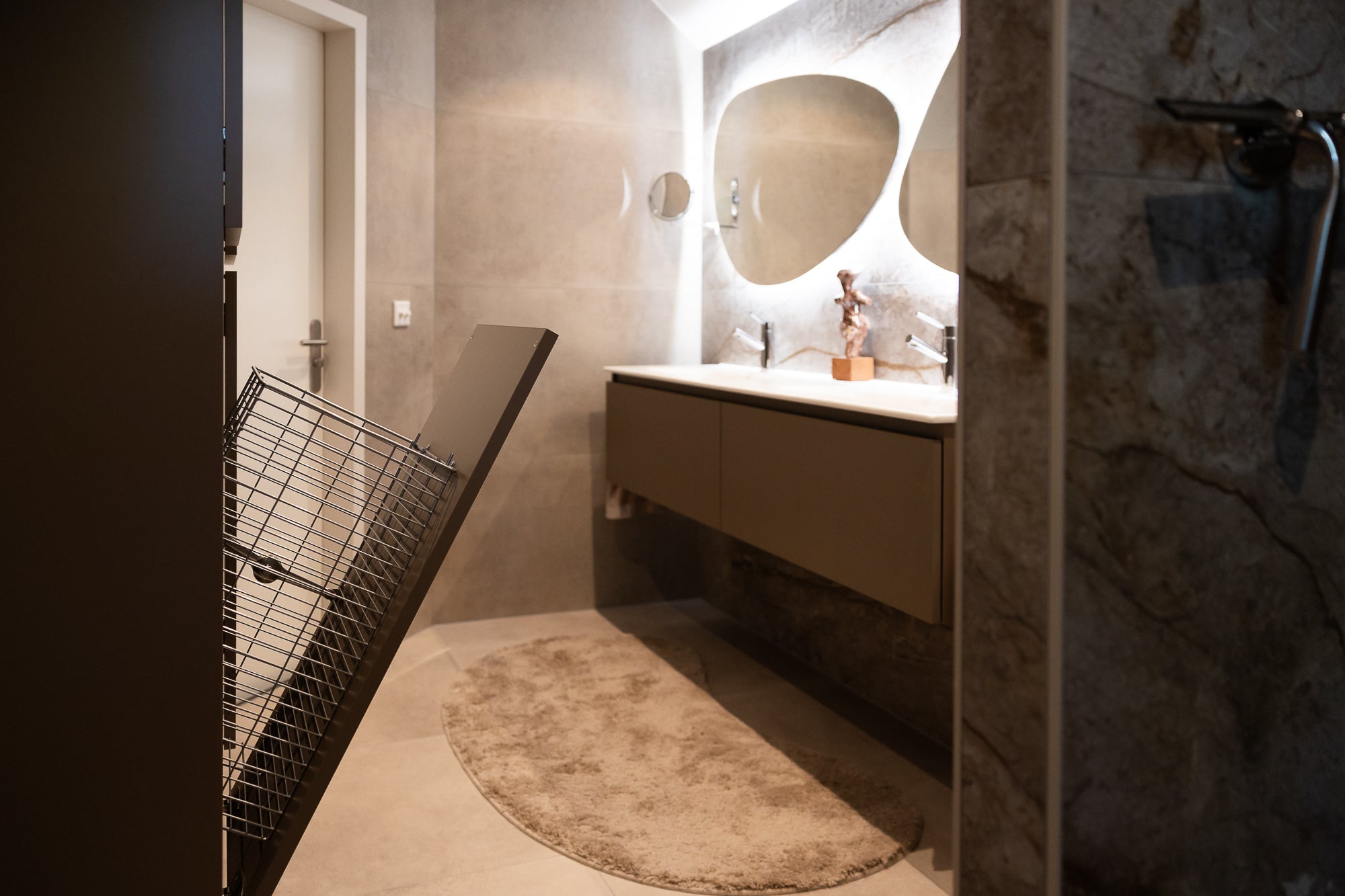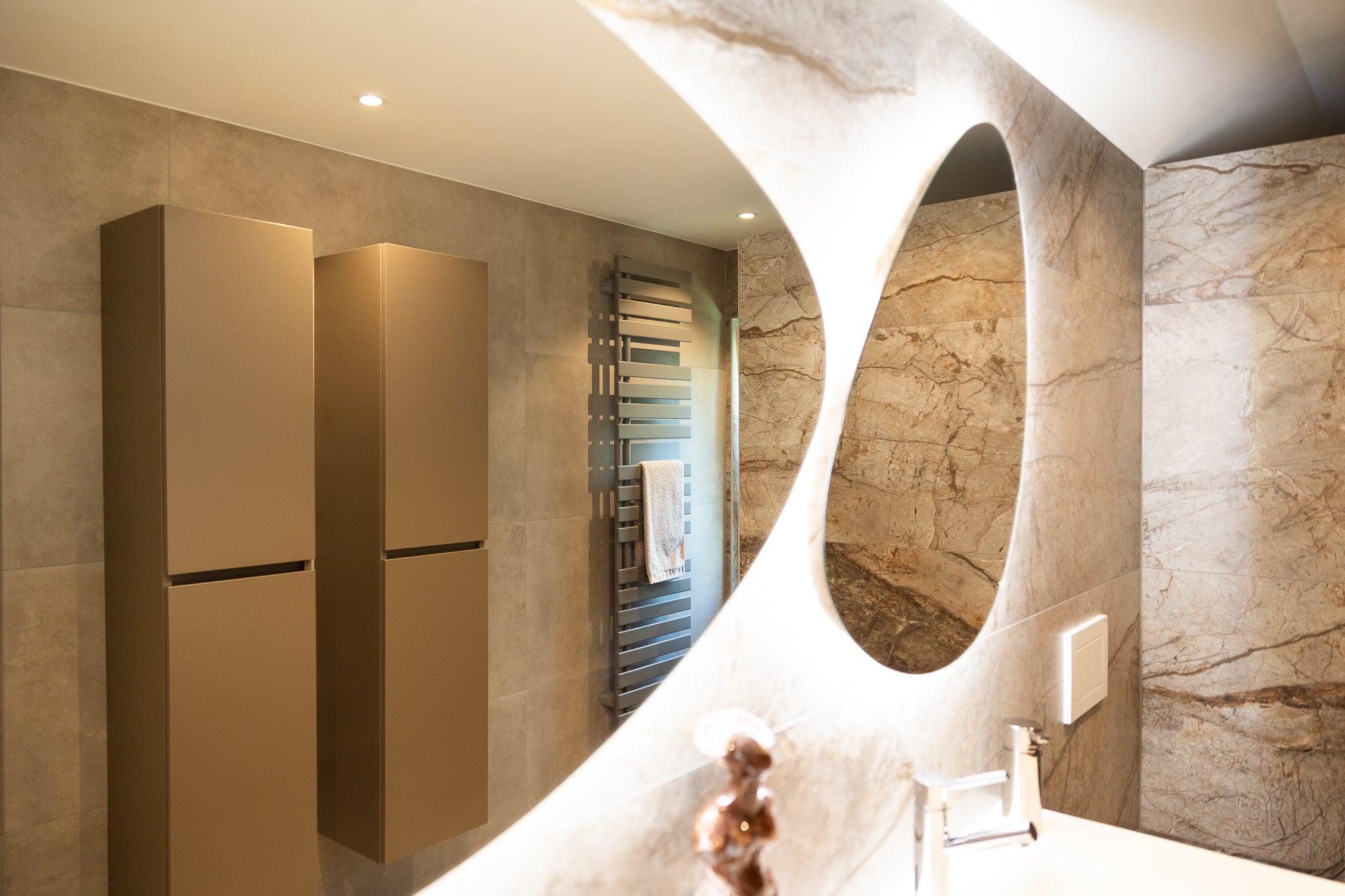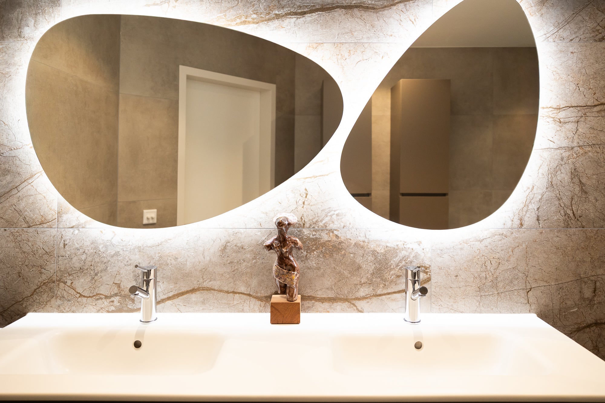 Opvallend zijn de twee organisch gevormde spiegels boven de wastafel. Ze brengen een speels accent in het verder minimalistische geheel.