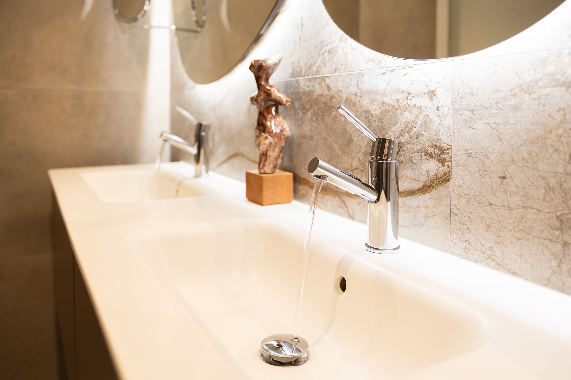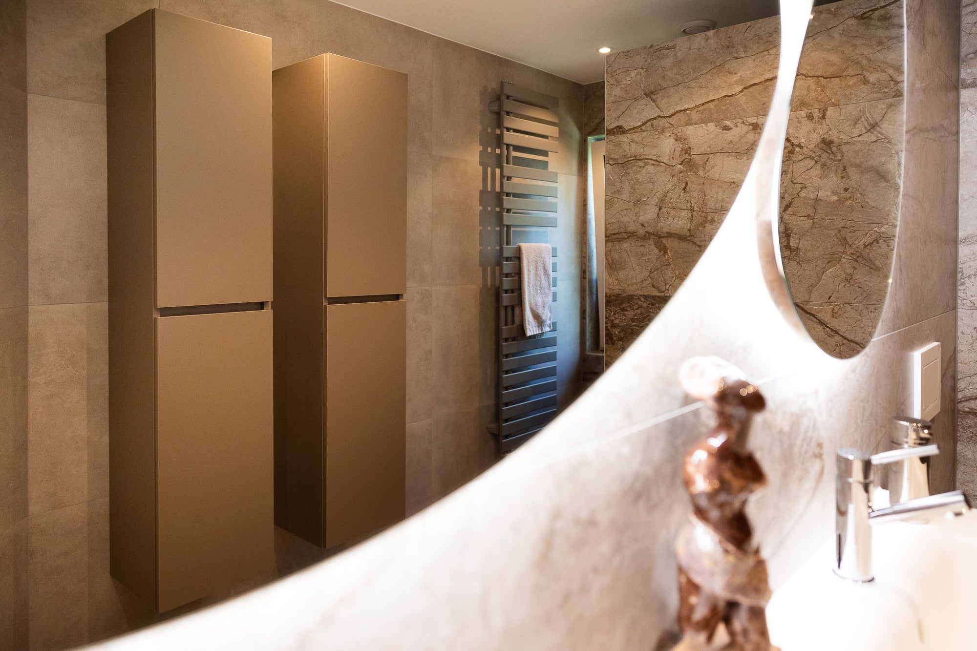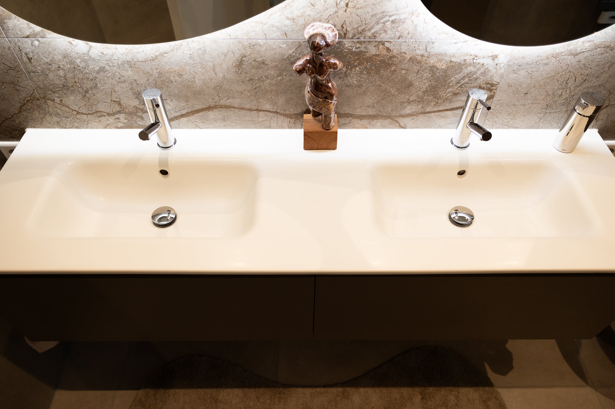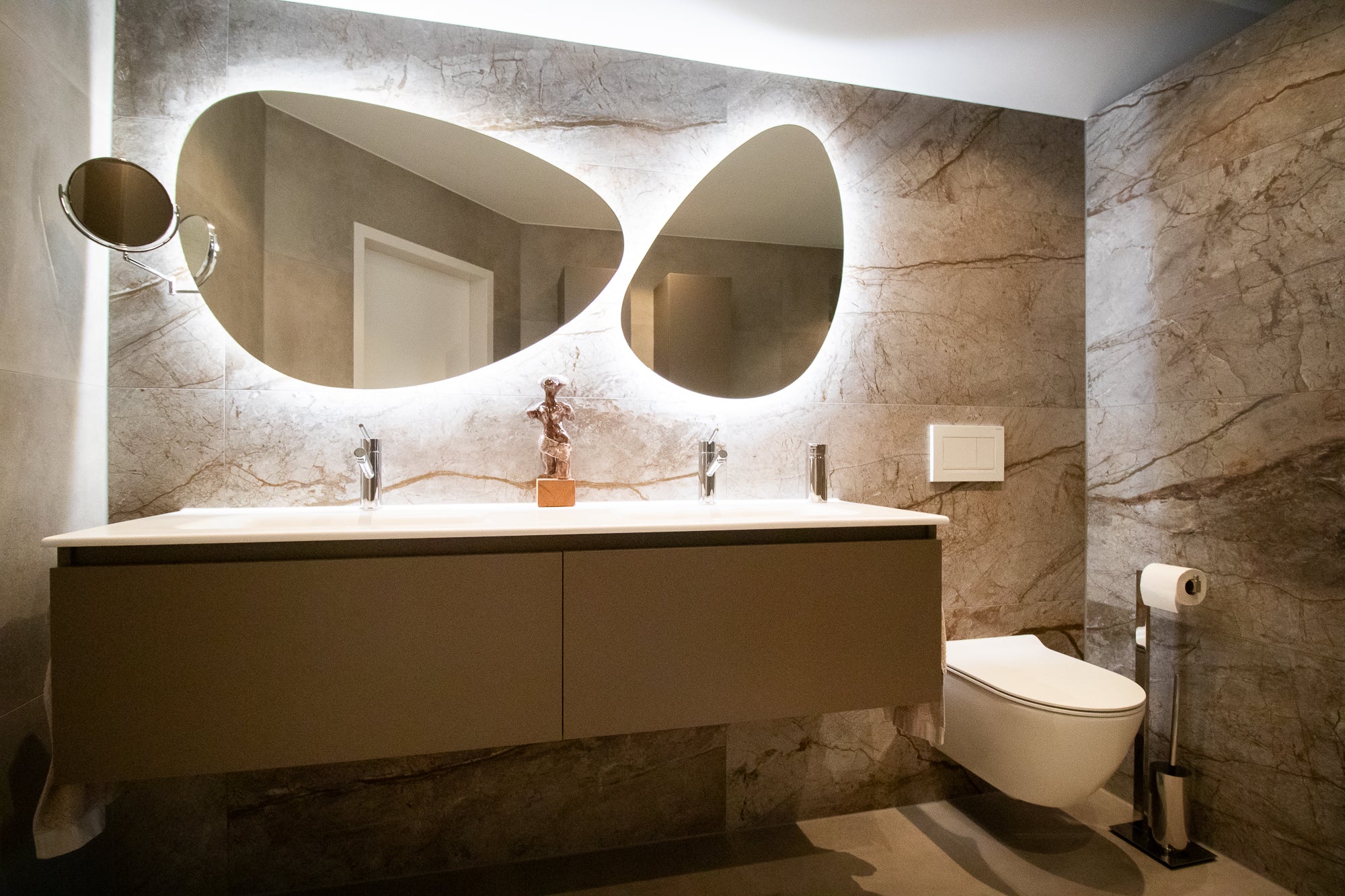Opvallend zijn de twee organisch gevormde spiegels boven de wastafel. Ze brengen een speels accent in het verder minimalistische geheel.