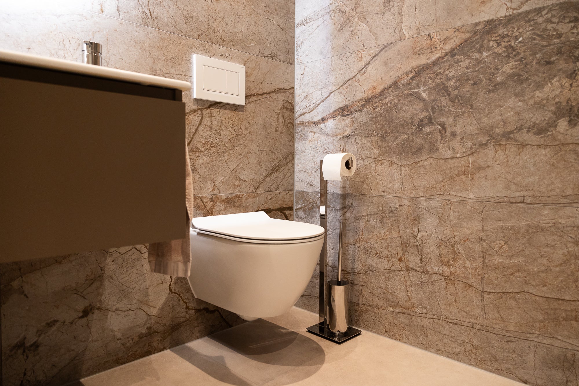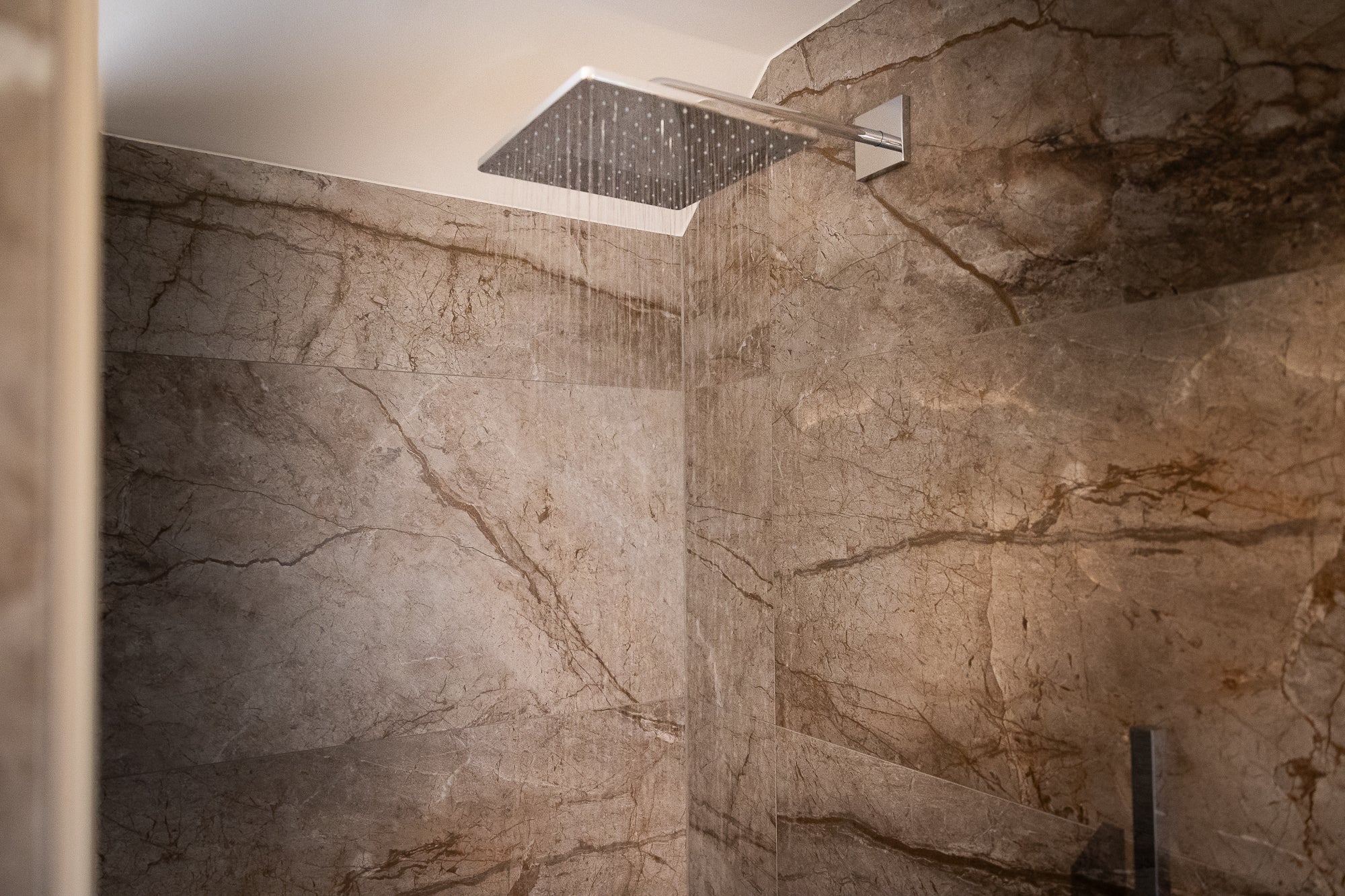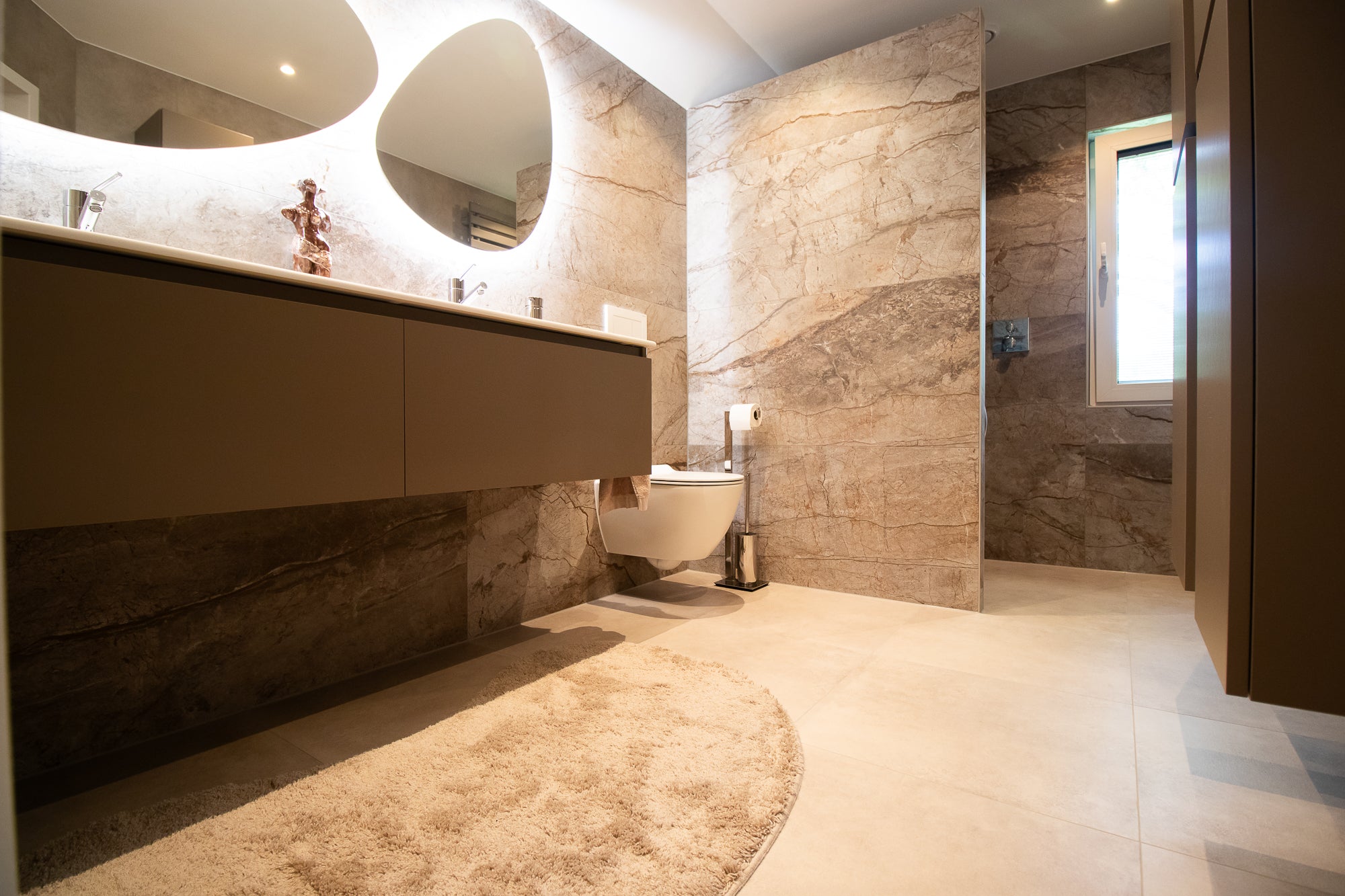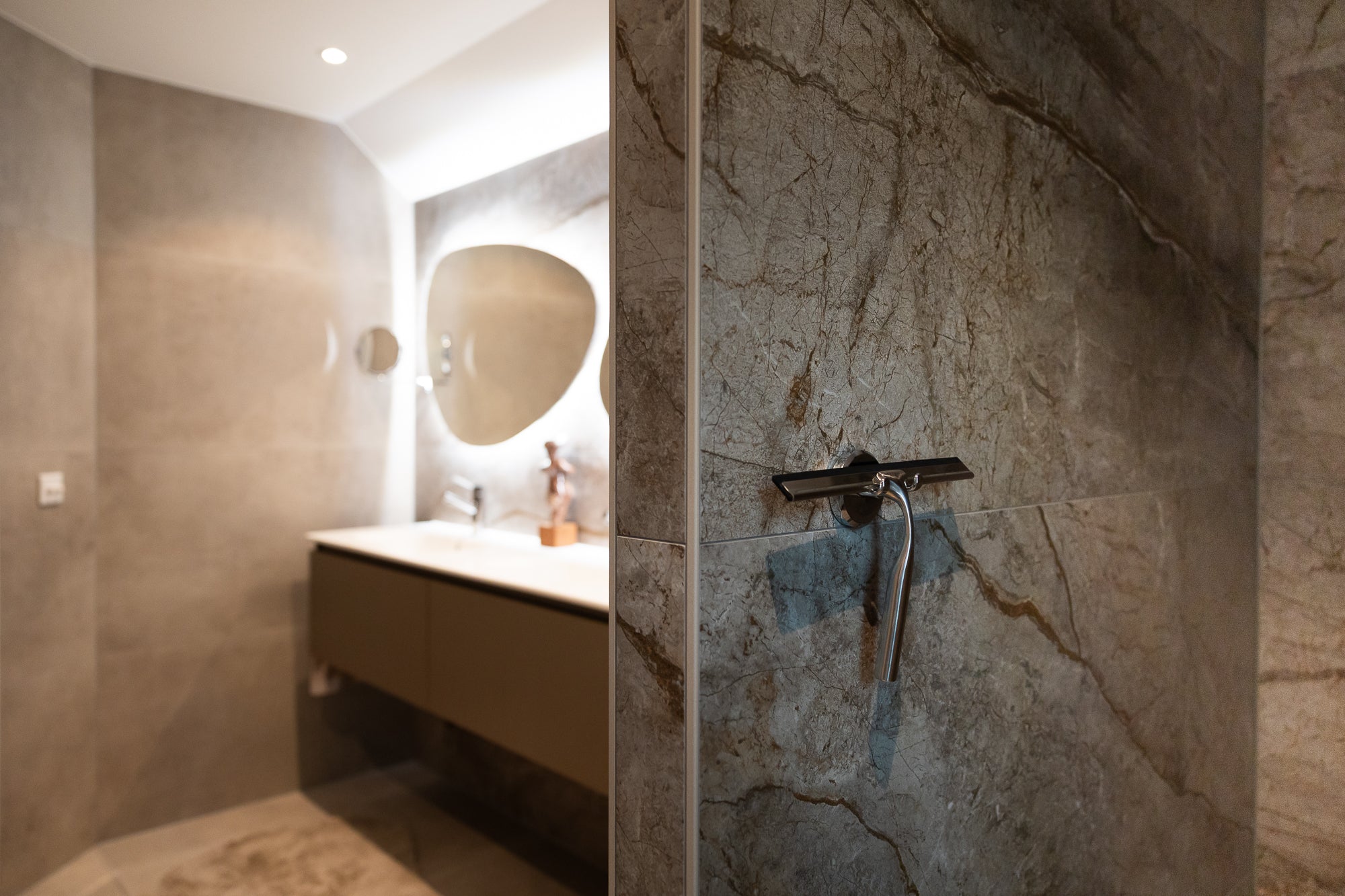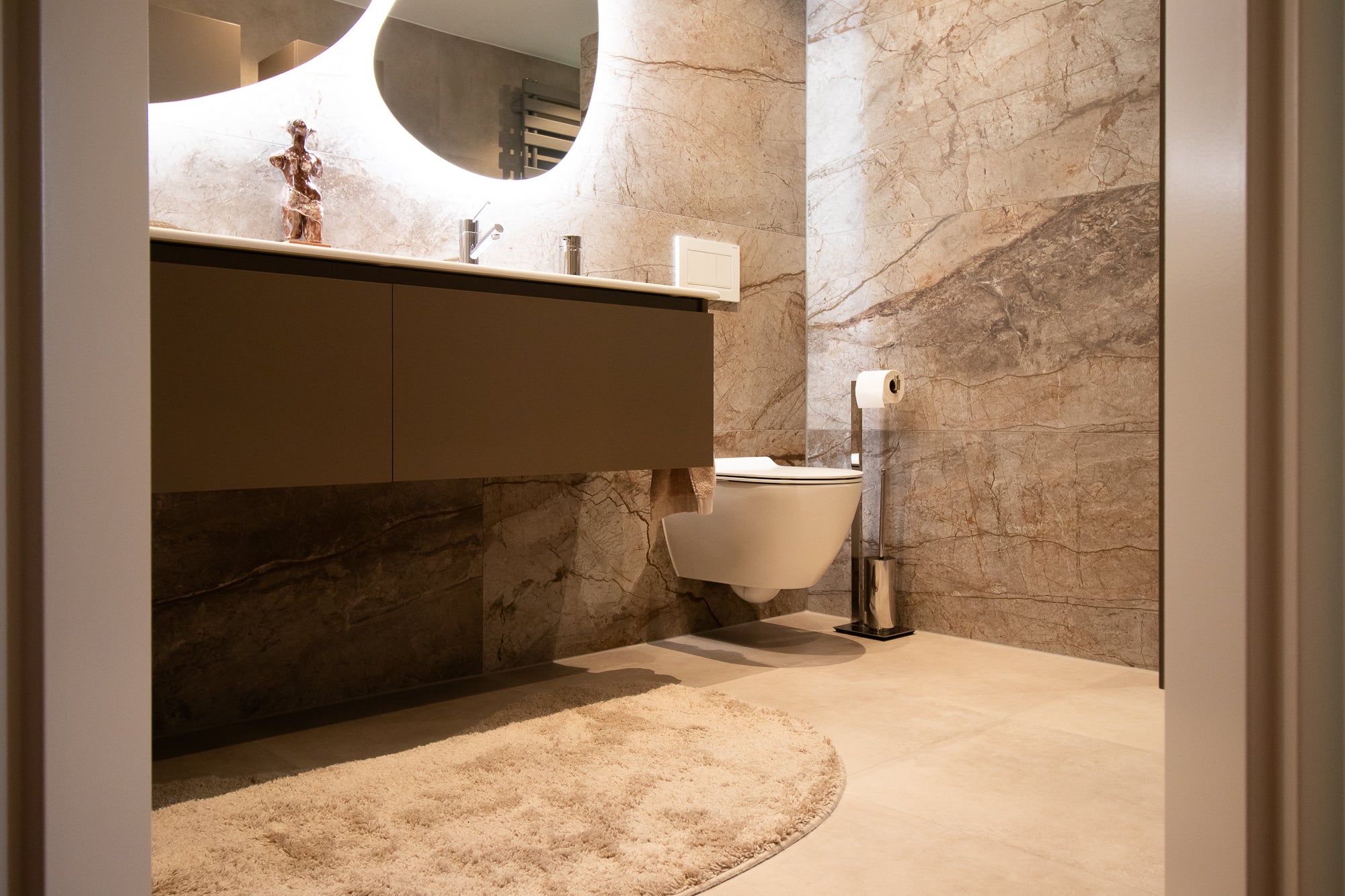 De wanden zijn bekleed met grote tegels in beige- en bruintinten met een subtiele marmerlook. De lichtbeige vloer sluit daar mooi op aan en zorgt voor een zachte, rustige basis.