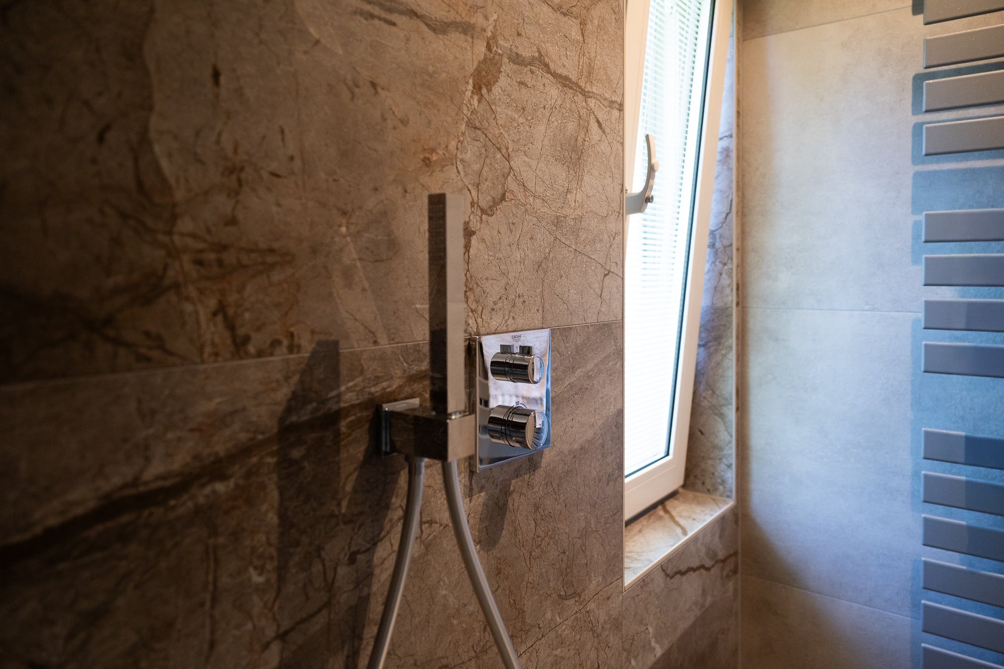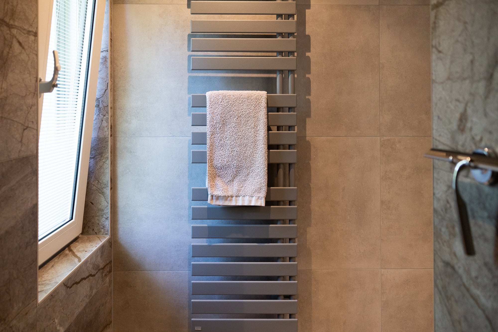 Naast het raam is een handdoekradiator geplaatst die zorgt voor comfort zonder afbreuk te doen aan de rust in het ontwerp. Het natuurlijke daglicht vult de ruimte en laat elk detail tot zijn recht komen.